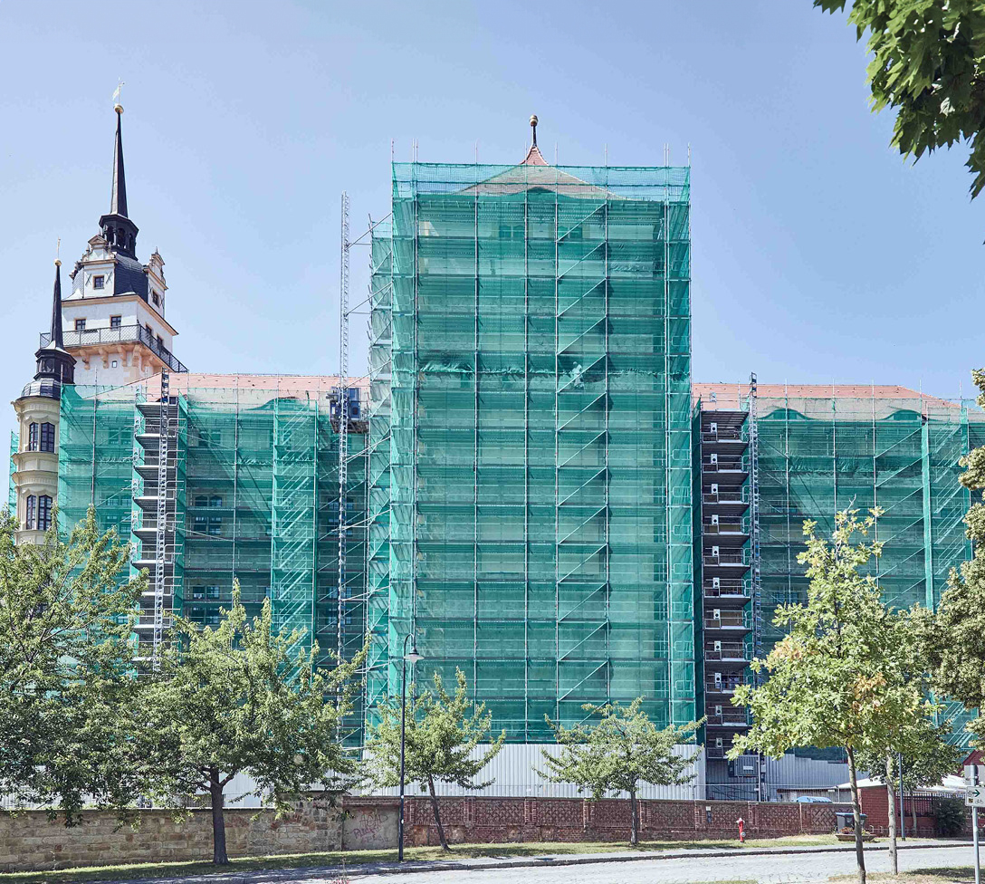 Es gilt als einer der wichtigsten Orte für die Reformation: Die Rede ist von Schloss Hartenfels im sächsischen Torgau. Dieses wird aktuell an der Fassade saniert, um das historisch bedeutende Meisterwerk der Frührenaissance für die Nachwelt zu erhalten. Möglich macht dies ein 3.800 m² großes Arbeitsgerüst der Lastklasse 4 von den regional ansässigen Gerüstspezialisten Beier. Schnell errichtet und optimal an die Gegebenheiten angepasst mit dem modularen Fassadengerüst AGS. Mit Sicherheit.