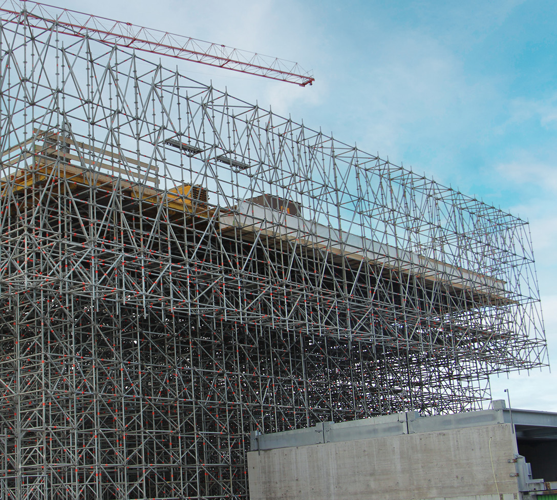 Das Allround Traggerüst TG 60 ist mit allen Grund- und Ausbauteilen des bewährten AllroundGerüsts von Layher kombinierbar und damit überaus flexibel im Einsatz.