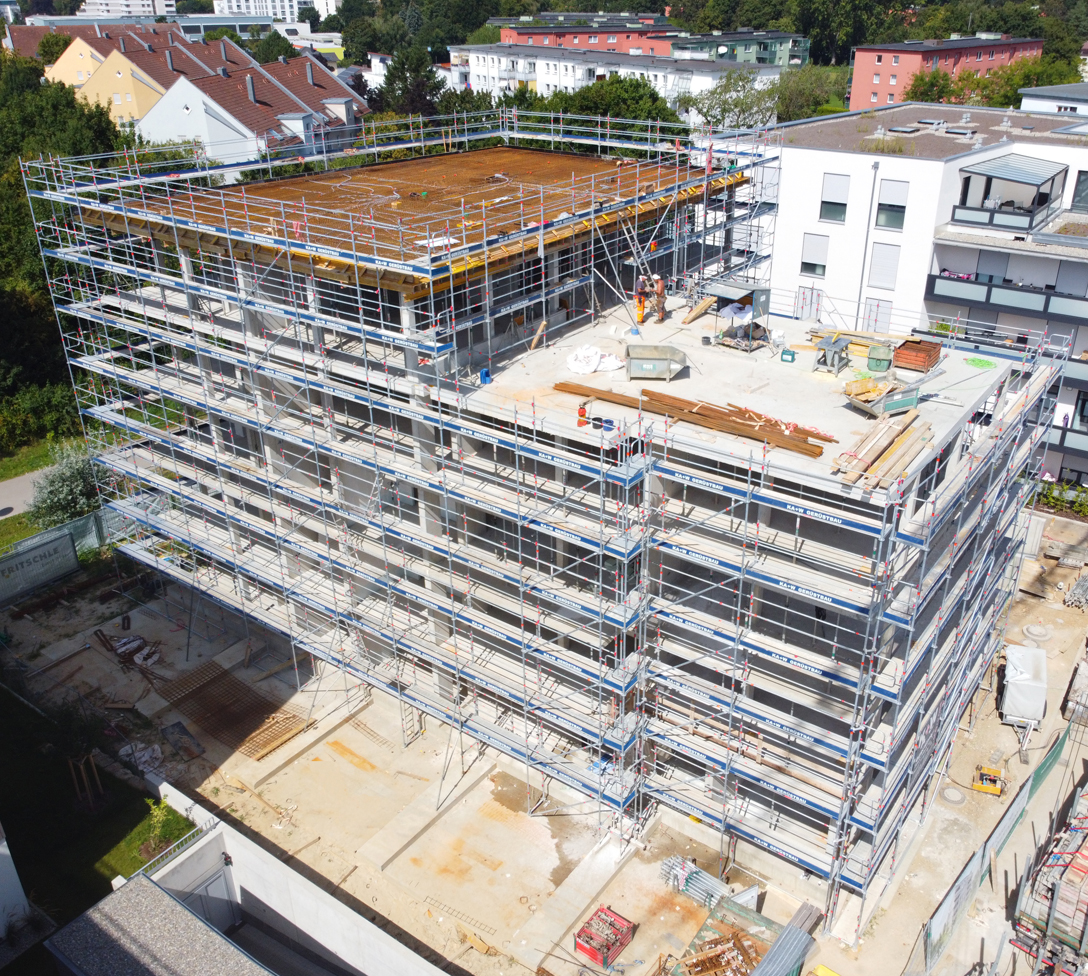 Die Errichtung eines Wohnkomplexes in Holz-Hybrid-Bauweise machte während der Rohbauarbeiten ein Schutzgerüst notwendig. Dieses sollte abschnittsweise mit Baufortschritt errichtet werden. Das modulare Fassadengerüst AGS sorgte dabei nicht nur für eine schnelle Montage und Demontage, sondern auch für einen zweiteilig vorlaufenden Seitenschutz – innen wie außen. Ein AGS-Podesttreppenturm gewährleistete zudem den schnellen und sicheren Aufstieg im Gerüst. Selbst mit Arbeitsmaterial. Eine Lösung mit System.