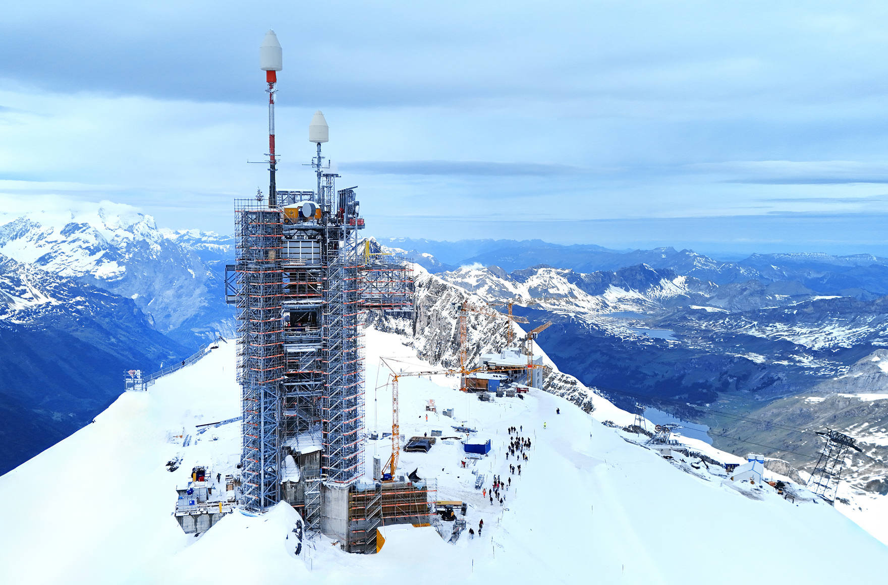 Im Schweizer Hochgebirge soll eine Bergstation neu interpretiert werden – zum Beispiel durch den Umbau eines Sendemasts zu einer modernen Stahl-Glas-Konstruktion. Der sogenannte Titlis Tower bietet künftig neben gastronomischen Angeboten auch Ausblicke auf das Bergpanorama. Die Voraussetzung? Verschiedene Fassaden-, Flächen-, Hänge- und Traggerüste. Mit dem flexiblen AllroundGerüst und passenden Ausbauteilen wie dem hochtragfähigen Aluminium-Träger FlexBeam ließen sich diese problemlos im System realisieren – mit bis zu 15 m langen Auskragungen. Eine schnelle Montage sowie eine effiziente Logistik der bis zu 300 t Gerüstmaterial war dabei dank leichter, kompakter und zugleich tragfähiger Bauteile ebenfalls sichergestellt. Eine Lösung mit System.