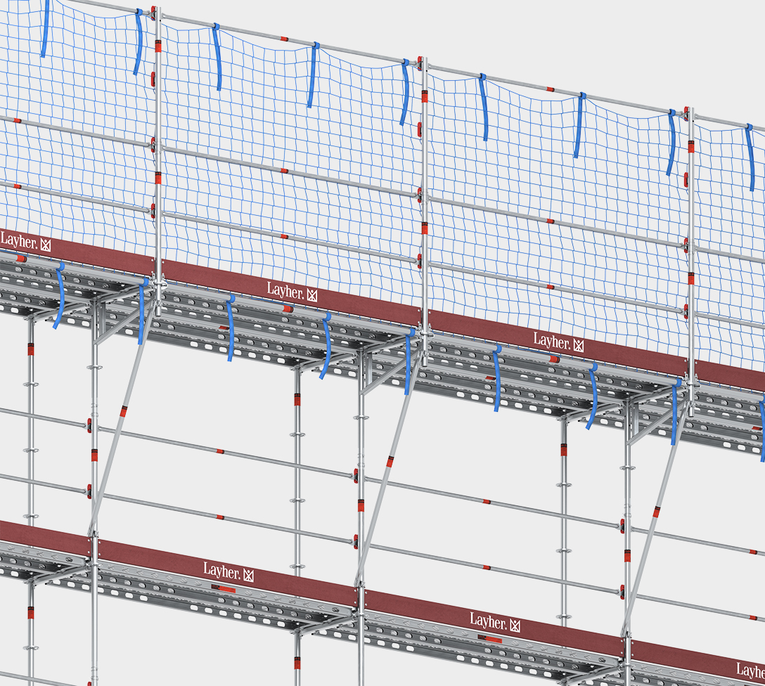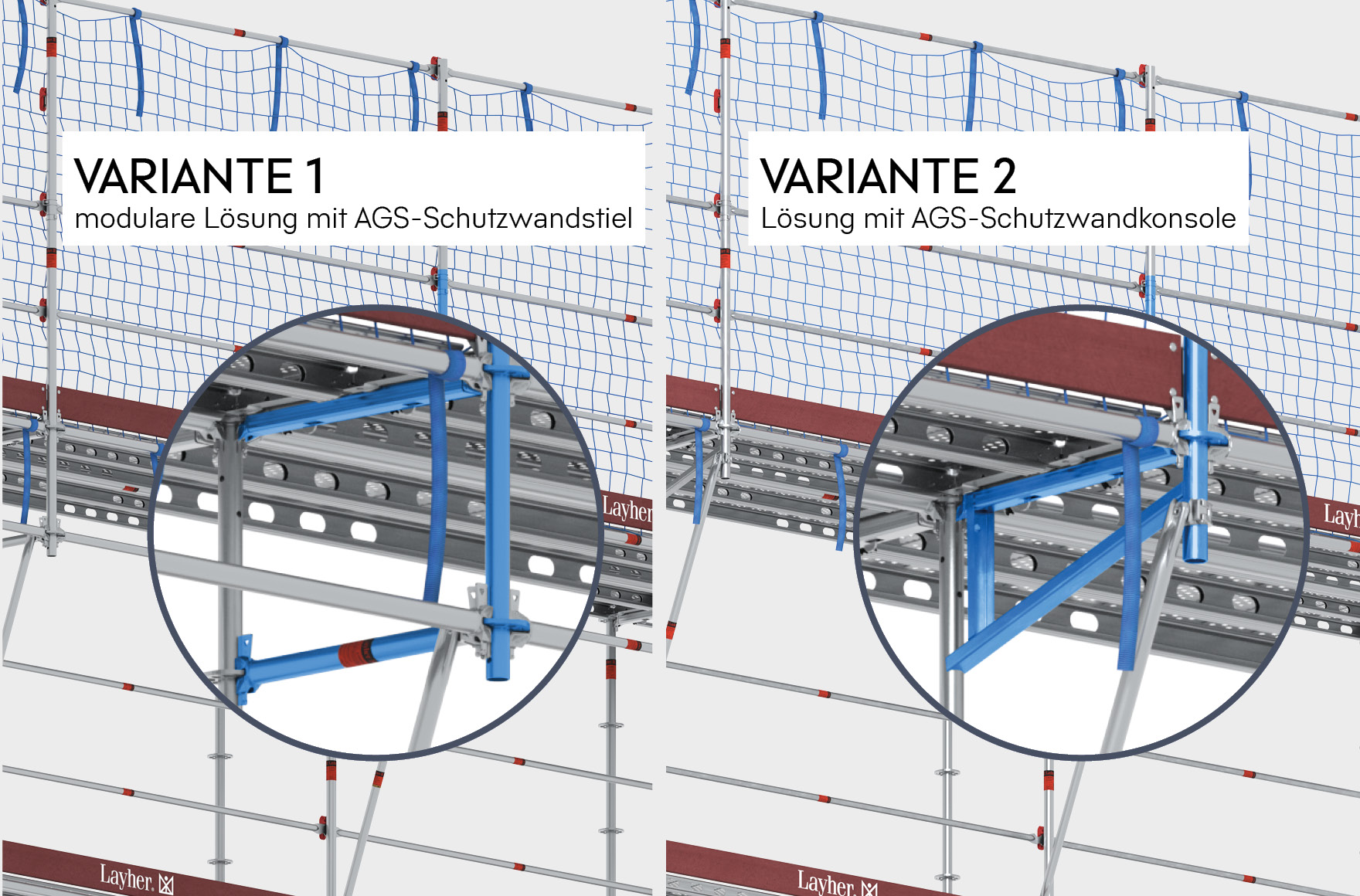 Um Schutzwände für das modulare Fassadengerüst AGS zu erstellen, stehen zwei Möglichkeiten zur Verfügung. Beide erfüllen die Anforderungen der TRBS 2121-1 und sind vorlaufend montierbar ohne den Einsatz einer PSAgA. Zum Einsatz kommen hierfür neben Standard Allround Bauteilen nur wenige Ergänzungsbauteile zum AGS-System.