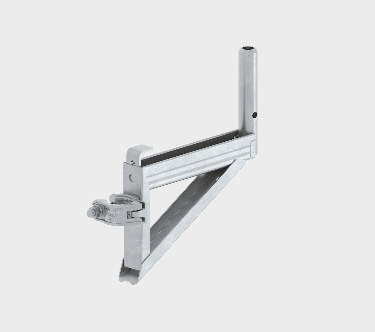 Das Blitz Gerüst lässt sich schnell nach innen oder außen verbreitern: Die Konsolen werden mit der angeschweißten Halbkupplung im Knotenblechbereich oder in Eckbereichen als Schwenkkonsolen über dem Rohrverbinder des Blitz Stellrahmen Lightweight befestigt und bilden dann eine Bodenebene mit dem Hauptgerüst.