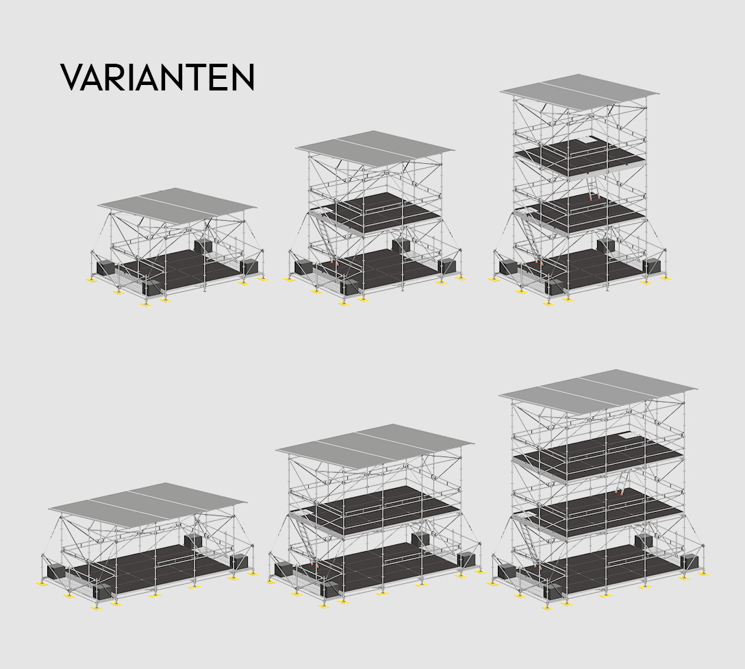 Das Baukastensystem kombiniert mit dem flexiblen Layher AllroundGerüst bietet eine überzeugende Einsatzvielfalt. Egal ob zwei oder drei Felder breit, ob mit Vordach und Antritt oder ohne, ob ein-, zwei- oder dreistöckig. Das Layher FOH-Turm Baukastensystem macht mehr möglich.