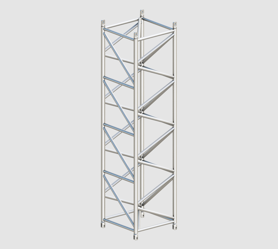 Die neuen Layher PA-Türme aus Maxi-Truss sind kompakt zu lagern und schnell zu errichten. Sie dienen für alle Arten an Beschallungs­anlagen, die ein Eigen­gewicht von bis zu 2 t haben können. Die Lösung besteht aus wenigen Einzel­teilen. Das bewährte Layher AllroundGerüst ist die Basis und wird durch das Universal Base ergänzt. Auf dieser Basis wird ein bis zu 12 m langer Truss­verbund aufgebaut, an dessen Kopf­stück der Aluminium-Träger TwixBeam als Krag­arm ange­bracht wird.