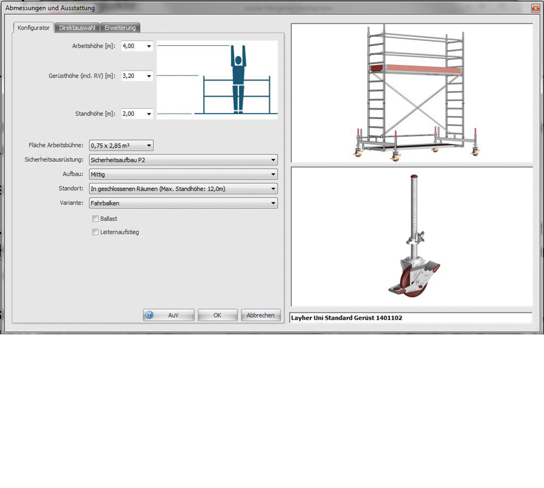 Konfigurieren Sie sich mit dem LayPLAN-Modul „Fahrgerüst-Konfigurator“ einfach und schnell Ihre passende Layher Fahrgerüst-Lösung. Egal ob standardisiert oder individuell - die Auswahl erfolgt nach Eingabe der Arbeitshöhe, der benötigten Arbeitsfläche sowie der gewünschten Aufbauvariante.