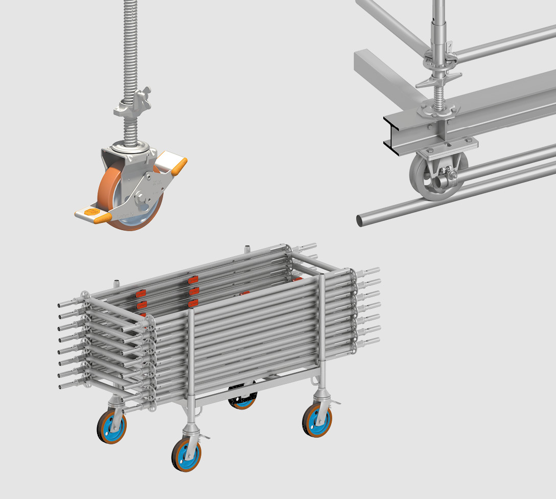 Layher bietet ein breites Sortiment an robusten Lenkrollen für unterschiedliche Belastungen und Einsatzbereiche – ideal für die fahrbare Ausbildung von Gerüsten nach DIN 4420-3.