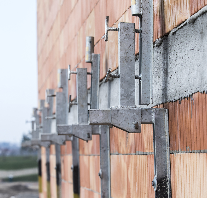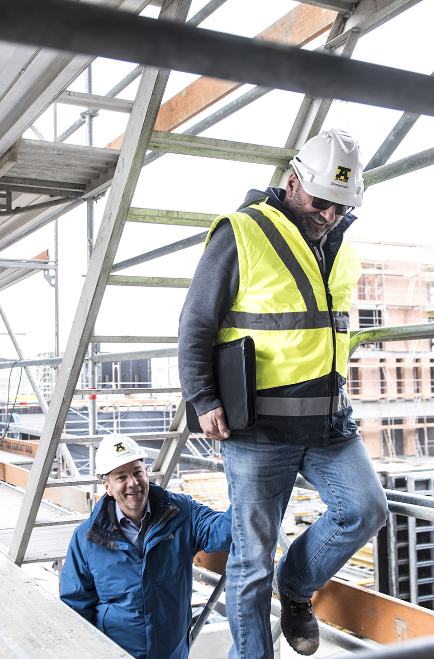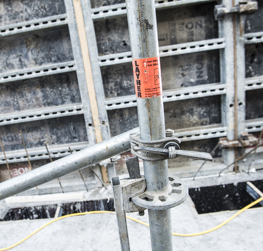 Neben dem wirtschaftlichen Vorteil schätzt Oberbauleiter Zimmermann vor allem die Qualität und Kompatibilität, gerade bei Gebäuden die besondere Ansprüche erfüllen sollen. „Wir nutzen unser Layher Allround-Material im Bauprozess vor allem für den flexiblen und sicheren Zugang zu Arbeitsbereichen, die nicht ohne weiteres zu erreichen sind.“ Der großen Verantwortung für seine Mitarbeiter ist sich Horst Zimmermann bewusst, und genau deshalb baut er auf Layher Material. „Der unkomplizierte Aufbau der Gerüstelemente spart Zeit und ist auch an ungewöhnlicher Gebäudegeometrie einsetzbar.“ Für die Montage der Layher Abschalkonsolen an einem Bauabschnitt errichtet Amos mit seinem Allround Material z.B. ein gut vier Meter hohes, freistehendes Gerüst, das mittels Kran sehr unkompliziert an die passende Stelle befördert werden kann. „So arbeiten unsere Mitarbeiter ganz standsicher auch in größeren Höhen und können sich voll auf die Qualität ihrer Arbeit konzentrieren – lästiges Auf- und Abbauen entfällt.
