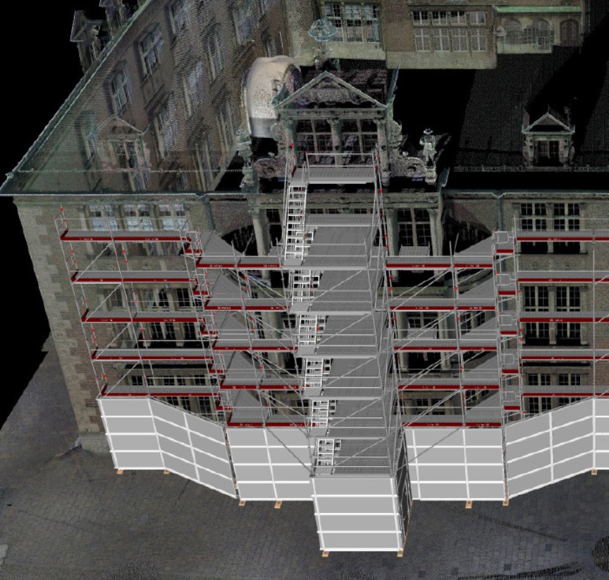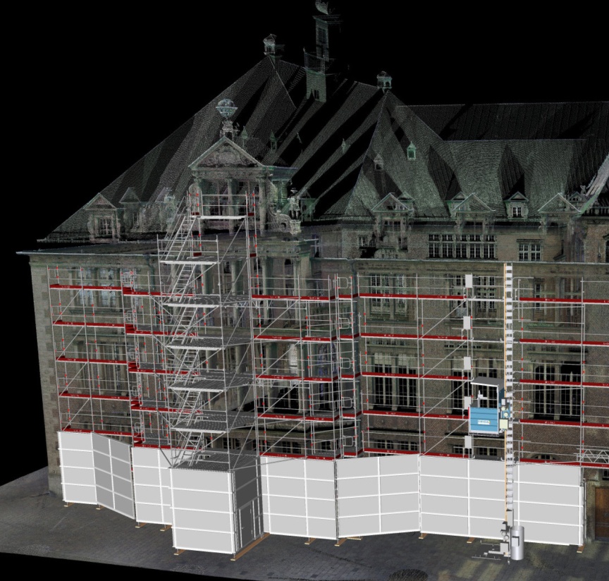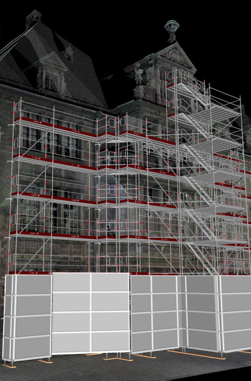 Wenn Gebäude wie das Bremer Rathaus über Jahrhunderte immer wieder ergänzt bzw. um- und angebaut wurden, sind aussagekräftige Baupläne meistens nicht verfügbar. Die Möglichkeit Baukörper mit einem 3D-Laserscan sehr detailliert zu vermessen und auf dieser Basis eine effiziente digitale Gerüstplanung aufzusetzen, vereinfacht den gesamten Prozess erheblich. „Gerüstbau ist mittlerweile großteils echter Ingenieurbau und viel Statik, dafür brauchen wir verlässliche Pläne, flexibles Gerüstmaterial und starke Partner. Als überzeugte Layher Kunden profitieren wir von der umfassenden Grundidee des Integrierten Systems und den vielen Serviceangeboten erheblich und machen für unsere Kunden immer wieder mehr möglich“, erläutert Tharia. „Die 3D-Aufnahmen der Scans sind so detailliert, dass wir damit nicht nur unser Gerüst sehr detailliert planen können, sondern die Verantwortlichen der Stadt sich auch vorstellen konnten, unsere Scans – quasi als Zweitverwertung – zur Dokumentation der Bausubstanz ihrer Gebäude zu nutzen“, so Lars Ukena, projektverantwortlicher Bauleiter bei der Wilh. Bädecker Gerüstbau GmbH. Durch die digitale Planung im Rahmen der LayPLAN SUITE wird auch die Materiallogistik effizienter, was bei Baustellen in der Innenstadt ein durchaus relevanter Faktor ist.