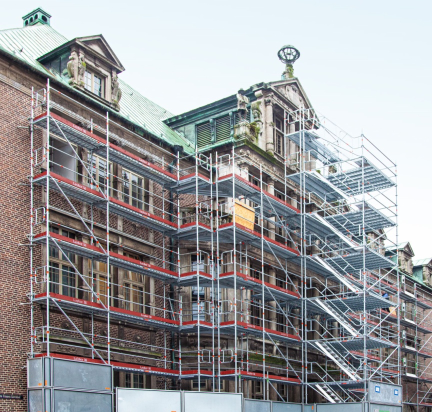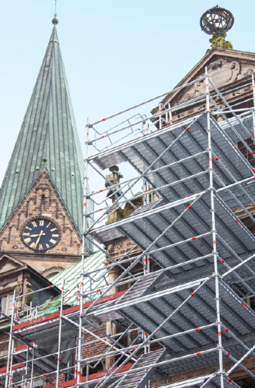 Jedes Jahr kommen 37 Millionen Tagesbesucher an die Weser nach Bremen und besuchen die historische Altstadt und die vielen Wahrzeichen der Stadt. So zum Beispiel das mittelalterliche Schnoorviertel, die mächtige Rolandsstatue und das Denkmal der Bremer Stadtmusikanten. Direkt dahinter befindet sich das historische Bremer Rathaus mit seiner beeindruckenden Renaissancefassade und das neue Rathaus von 1913 mit seiner verklinkerten Fassade zum Domshof und zum Markt hin. Zur denkmalschutzkonformen Demontage und Sanierung der verbauten Holzfenster musste diese Fassade für die Tischler mit einem Arbeitsgerüst versehen werden. Das ist die Aufgabe des lokalen Traditionsbetriebes Wilh. Bädecker Gerüstbau GmbH, der hier auf das neue modulare Fassadengerüstsystem AGS von Layher setzt. Planungsbasis ist ein 3D-Laserscan des Gebäudes, aus dem die Laserscan Spezialisten von Layher einen digitalen Zwilling erstellten, an dem dann das Gerüst und die Statik geplant wurden.