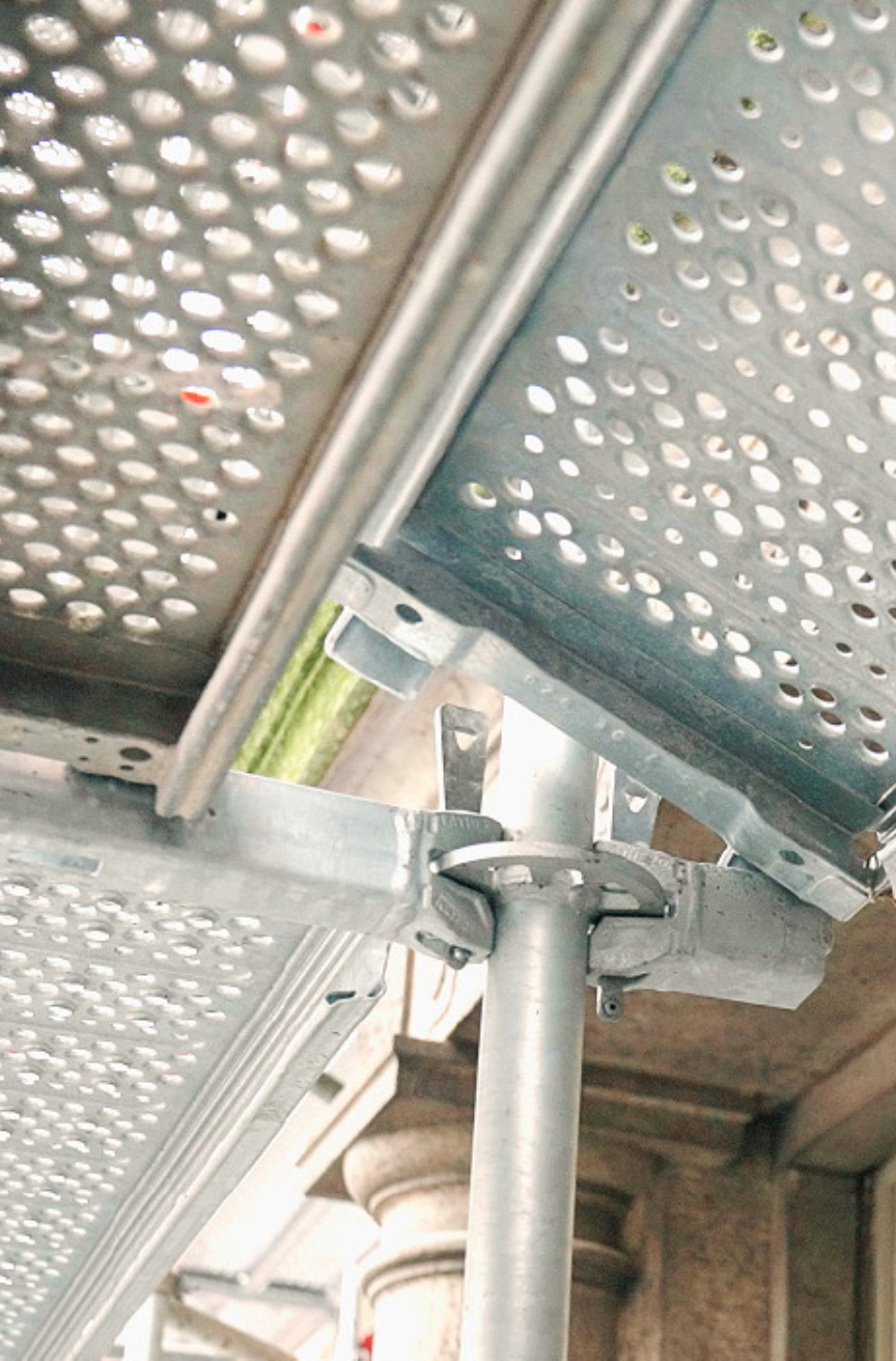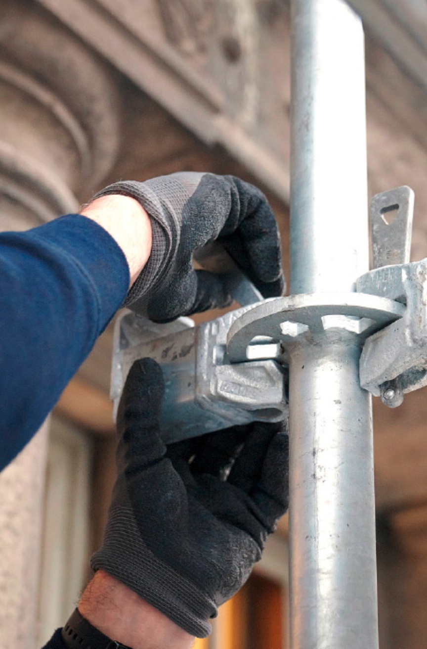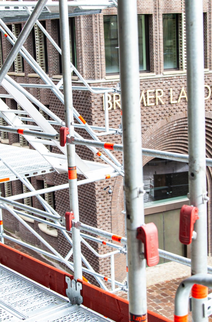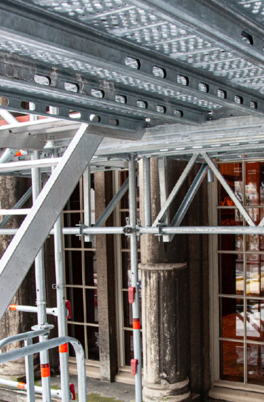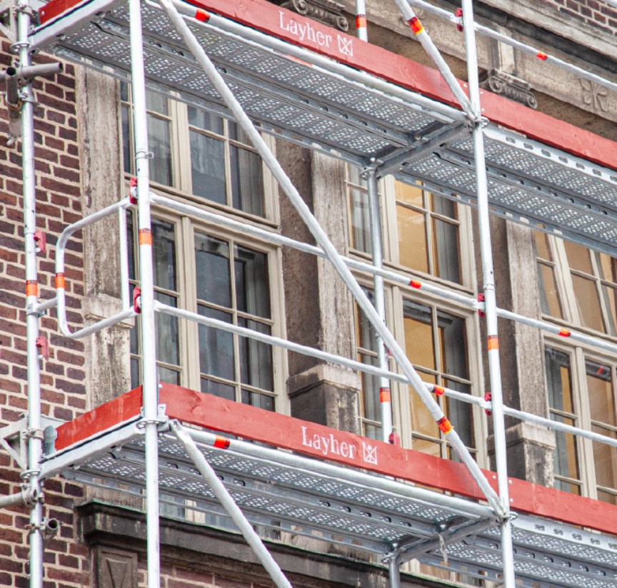 Das AGS System ist komplett in das Layher Gerüstsystem integriert und lässt sich somit problemlos mit allen Standard Allround Bauteilen kombinieren. „So können wir die AGS Grundkonstruktion ganz einfach und flexibel mit unserem Allround Bestandsmaterial ergänzen, um z. B. offene Ecken mit U-Stahlböden 45° zu schließen, mithilfe der Tipp-Topp-Konsole lassen sich fluchtende Belagskanten zur Fassade realisieren oder mit größeren U-Konsolen Nieschen im Baukörper einrüsten. Diese Flexibilität zeichnet das AllroundGerüst von Layher aus und ist das, was uns zu zufriedenen und überzeugten Layher Kunden macht“, resümiert Malik Tharia. Durch die besondere Lage der Baustelle und die Wichtigkeit des Gebäudes wird das Gerüst auf den unteren vier Metern komplett mit Layher Protect Kassetten verkleidet, um den unbefugten Zugang zu verhindern.