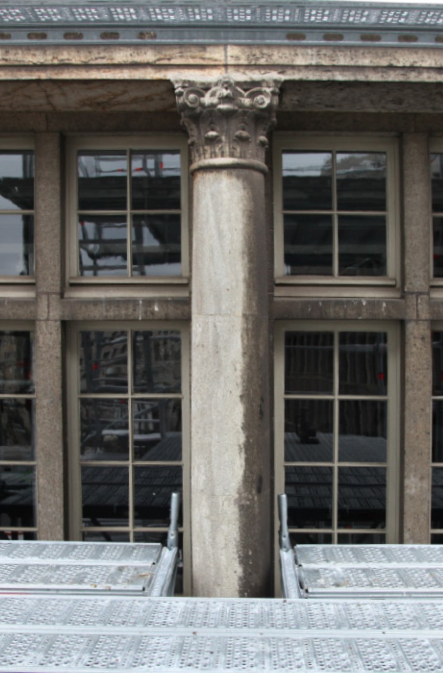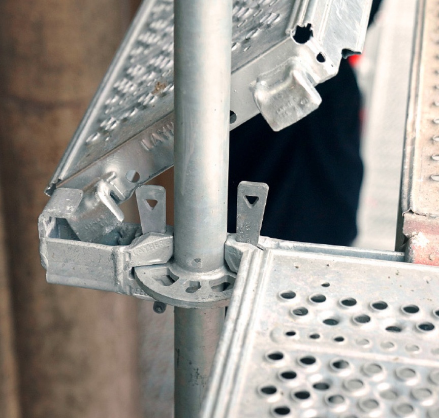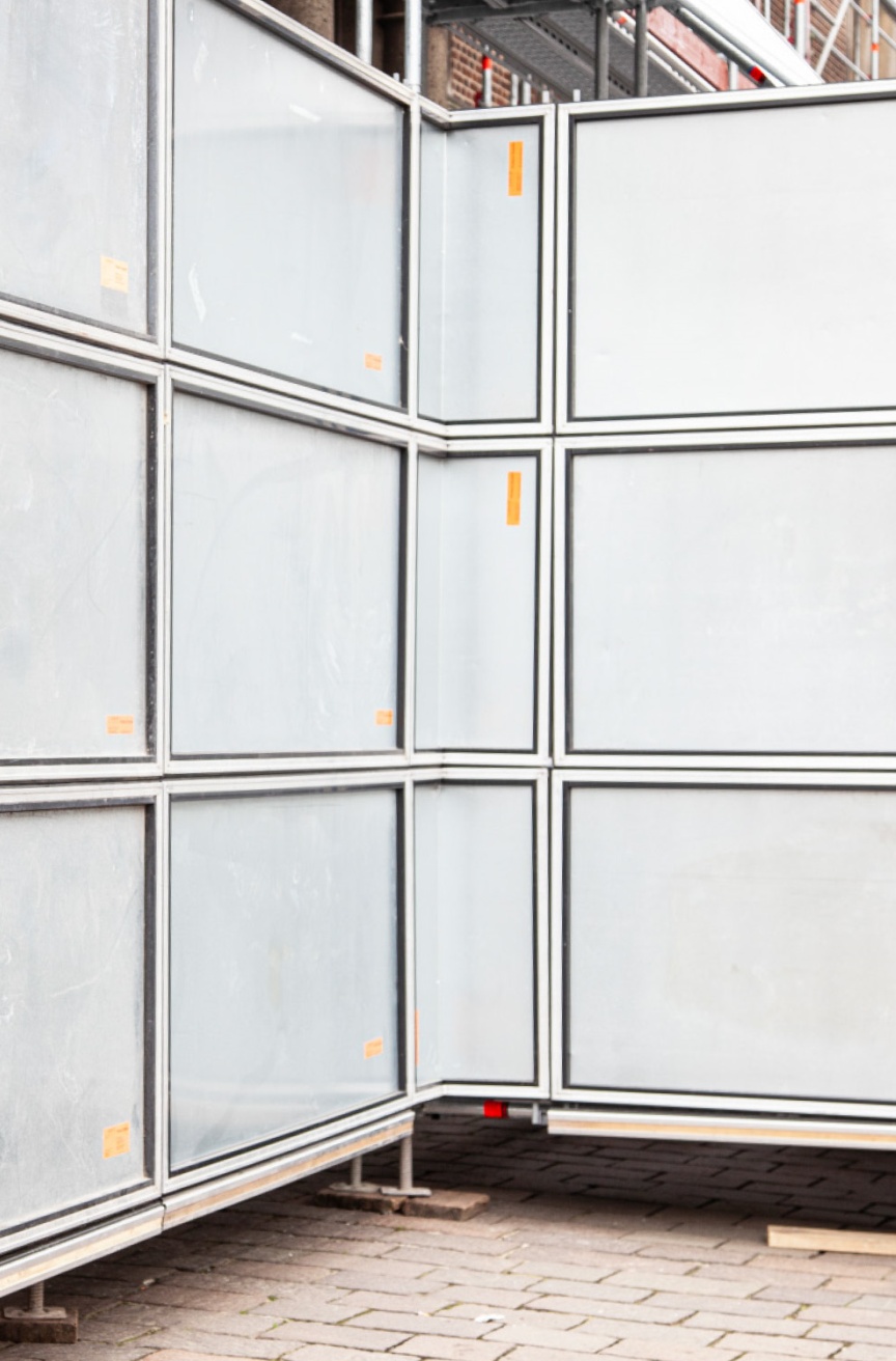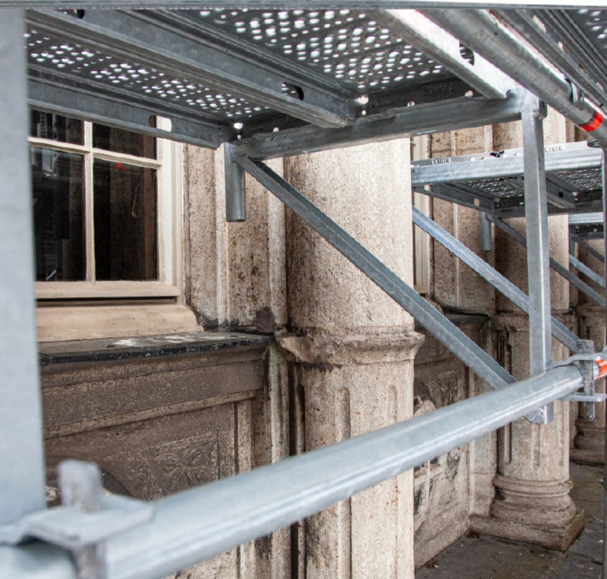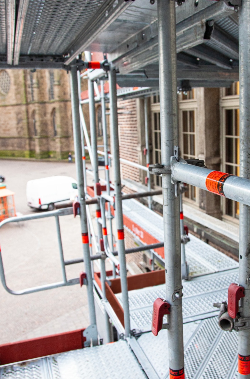 Das AGS System ist komplett in das Layher Gerüstsystem integriert und lässt sich somit problemlos mit allen Standard Allround Bauteilen kombinieren. „So können wir die AGS Grundkonstruktion ganz einfach und flexibel mit unserem Allround Bestandsmaterial ergänzen, um z. B. offene Ecken mit U-Stahlböden 45° zu schließen, mithilfe der Tipp-Topp-Konsole lassen sich fluchtende Belagskanten zur Fassade realisieren oder mit größeren U-Konsolen Nieschen im Baukörper einrüsten. Diese Flexibilität zeichnet das AllroundGerüst von Layher aus und ist das, was uns zu zufriedenen und überzeugten Layher Kunden macht“, resümiert Malik Tharia. Durch die besondere Lage der Baustelle und die Wichtigkeit des Gebäudes wird das Gerüst auf den unteren vier Metern komplett mit Layher Protect Kassetten verkleidet, um den unbefugten Zugang zu verhindern.