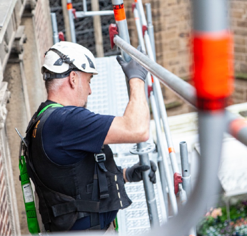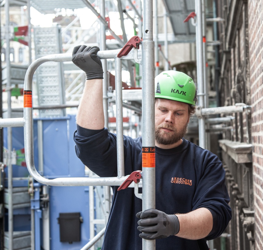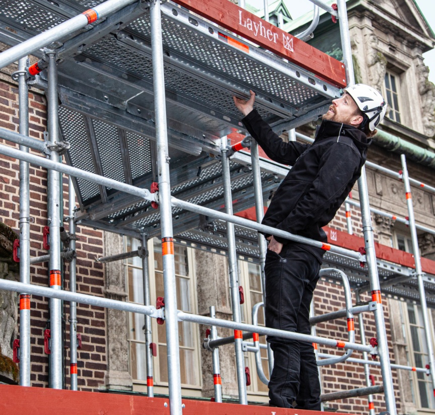 „Wir haben bei dieser Baustelle am historischen Rathaus erstmals das AGS System eingesetzt, um das Gerüst konsequent aus der gesicherten Lage und damit ohne zusätzliche PSA aufbauen zu können. Das ist nicht nur sicherer, sondern auch effizienter“, so Malik Tharia, Geschäftsführer der Wilh. Bädecker Gerüstbau GmbH. Die Kolonne mit drei Monteuren baut das Gerüst und den dazugehörigen Layher Podesttreppenturm und der Absetzplattform aus Allround Material in vier Wochen peu à peu, sodass die Restauratoren schon während des Aufbaus auf einer Seite mit Ihren Arbeiten beginnen können. So zeigt das neue AGS System an geschichtsträchtiger Stelle, was es alles kann.