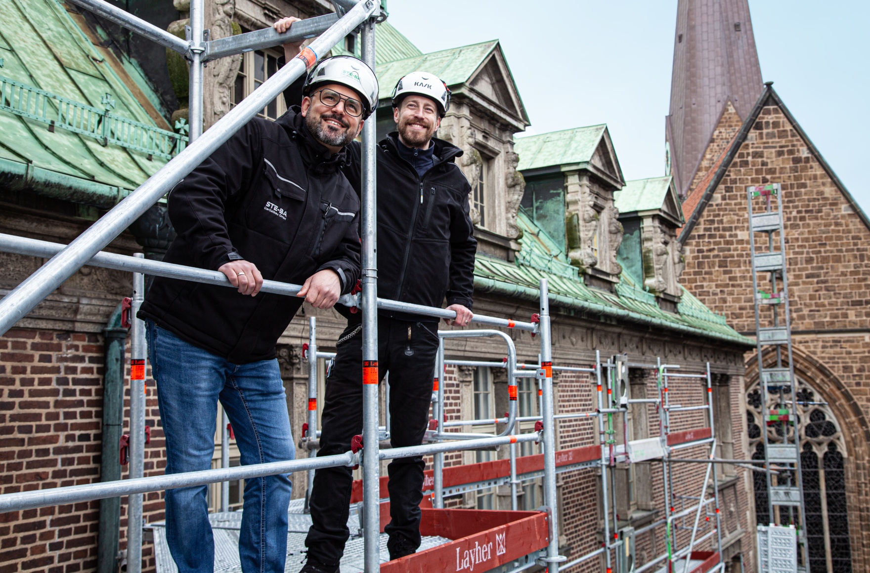 „Die partnerschaftliche Zusammenarbeit mit den Gerüstbauern von Bädecker ist die Basis für unser beider Erfolg“, so Ingo Barge, Gebietsverkaufsleiter bei Layher, und René Stender, Regionaler Vertriebsleiter von Layher, unisono. Die Gerüstspezialisten des Bremer Unternehmens wurden im Trainingszentrum von Layher in Eibensbach auf dem AGS System geschult und konnten so unmittelbar von der Erfahrung der Layher Richtmeister profitieren. „Auch sonst arbeiten wir bei vielen Projekten eng zusammen, was sich bei diesem Projekt an der gemeinsamen Planung auf Basis des 3D-Laserscans des Rathauses mit dem Technischen Büro in Eibensbach eindrücklich zeigt“, berichtet Lars Ukena. Mittlerweile haben die Bremer technisch wie personell aufgestockt und können mit einem eigenen technischen Zeichner und der Software der LayPLAN SUITE die Planung zunehmend digital selbst angehen.