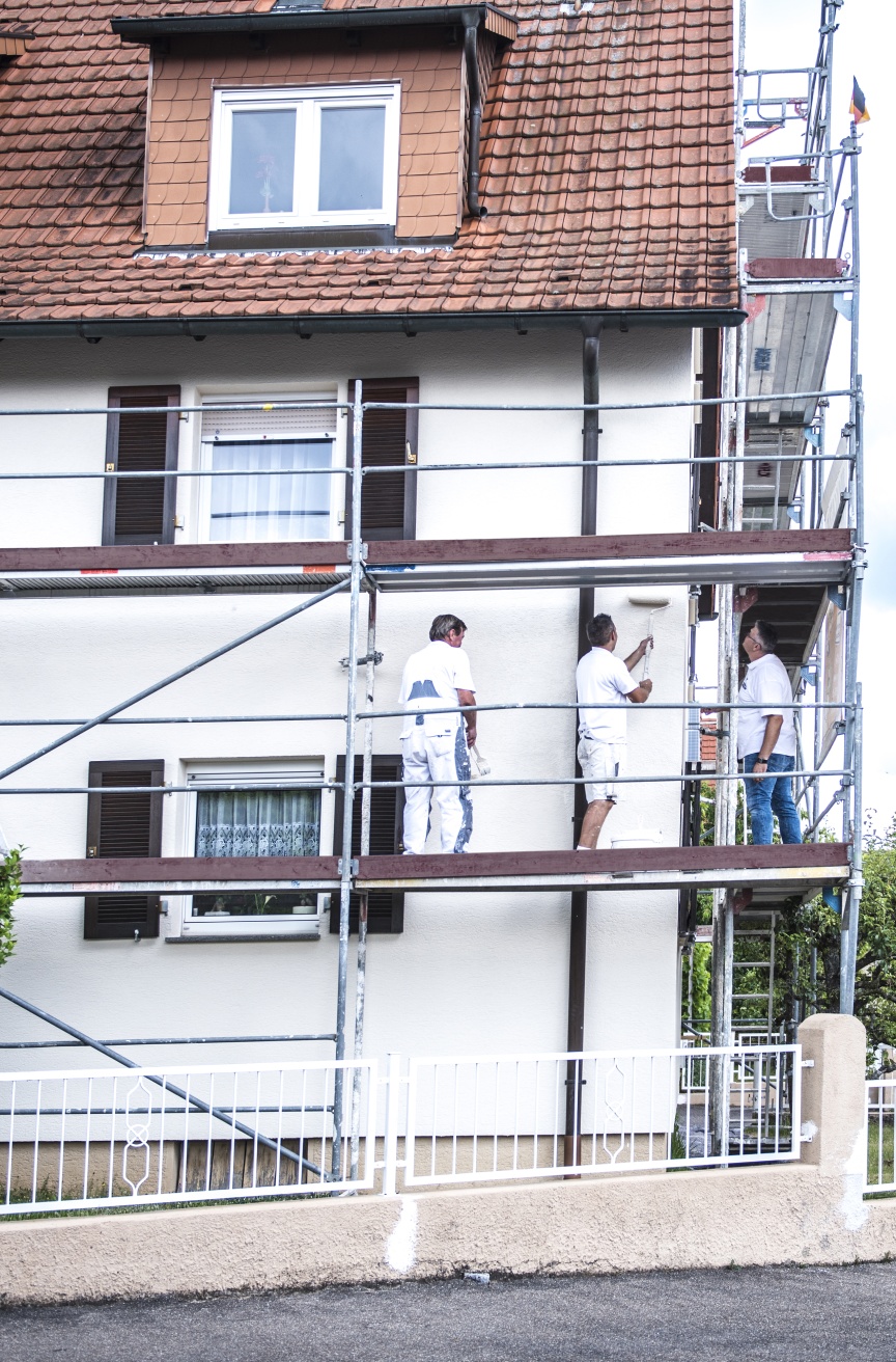 Seine erfahrenen Mitarbeiter bauen vor Ort das Gerüst auf und können durch das einfache Prinzip des führenden Steckrahmengerüsts und die für das Layher BlitzGerüst verfügbaren Ausbauteile problemlos auf die Gegebenheiten vor Ort reagieren. Leichte, einteilige Böden, auch aus Aluminium, erleichtern dabei sowohl den Transport wie den Aufbau. Mit nur sechs Grundelementen und wenigen Handgriffen ist dieses Gerüst in logisch-sicherer Aufbaufolge schnell und schraubenlos montiert. Beim aktuellen Projekt eines Mehrfamilienhauses wurden die knapp 650 m2 Fassadengerüst von 3 Mitarbeitern in gut 2 Tagen gestellt. Es kamen auch Durchstiege mit intergierten Leitern für den sicheren Aufstieg sowie überlange Böden zum Einsatz, um eine Garageneinfahrt auch während der Sanierungsarbeiten befahren zu können. Weitere Konsolen helfen den großen Dachvorsprung passend einzurüsten.