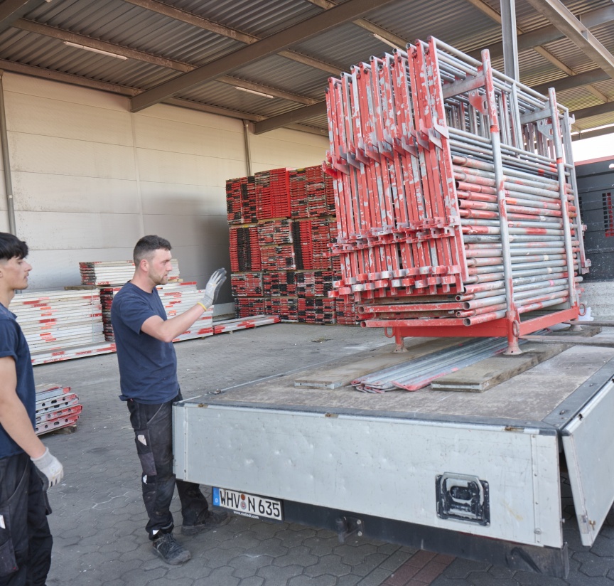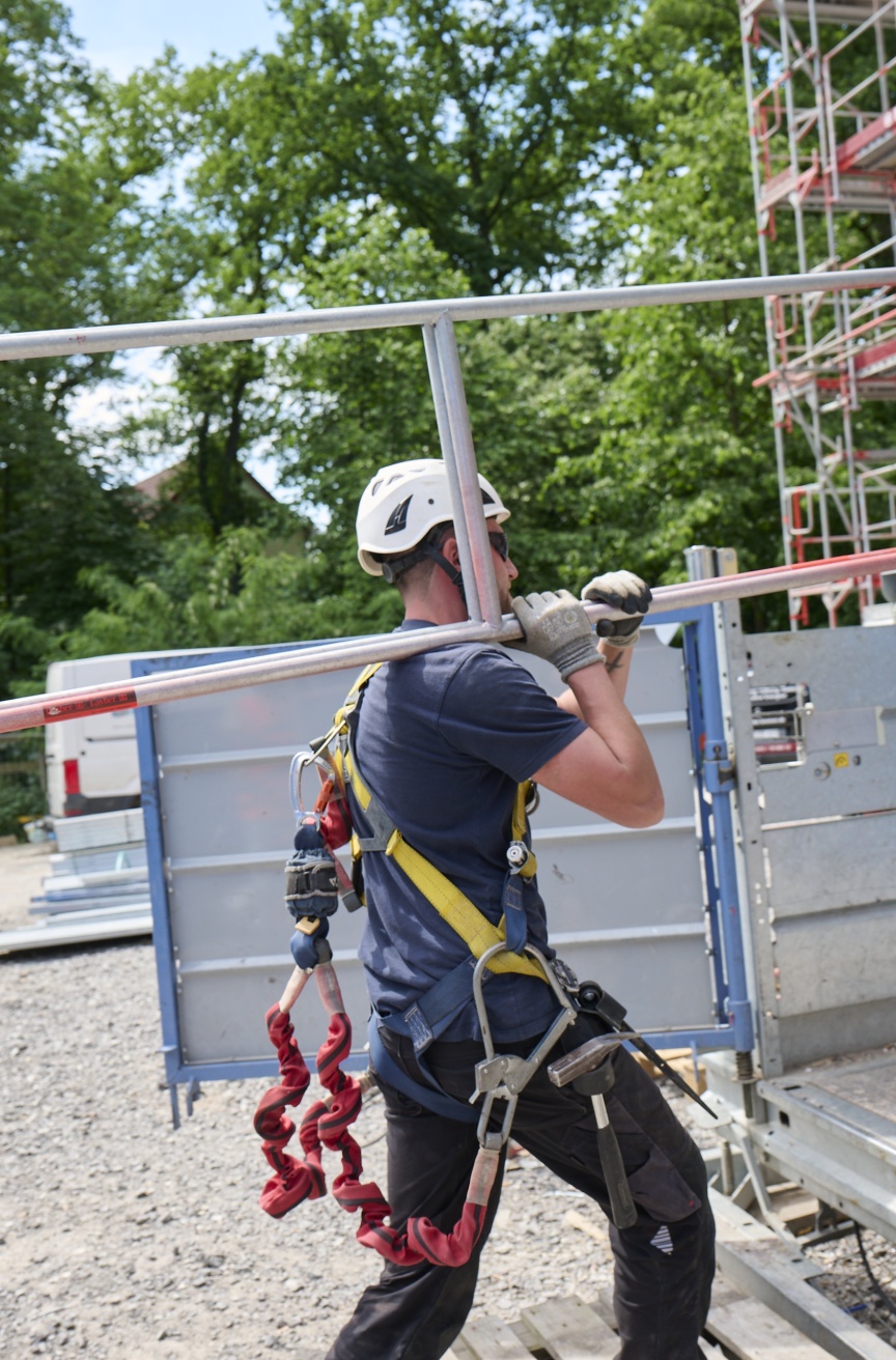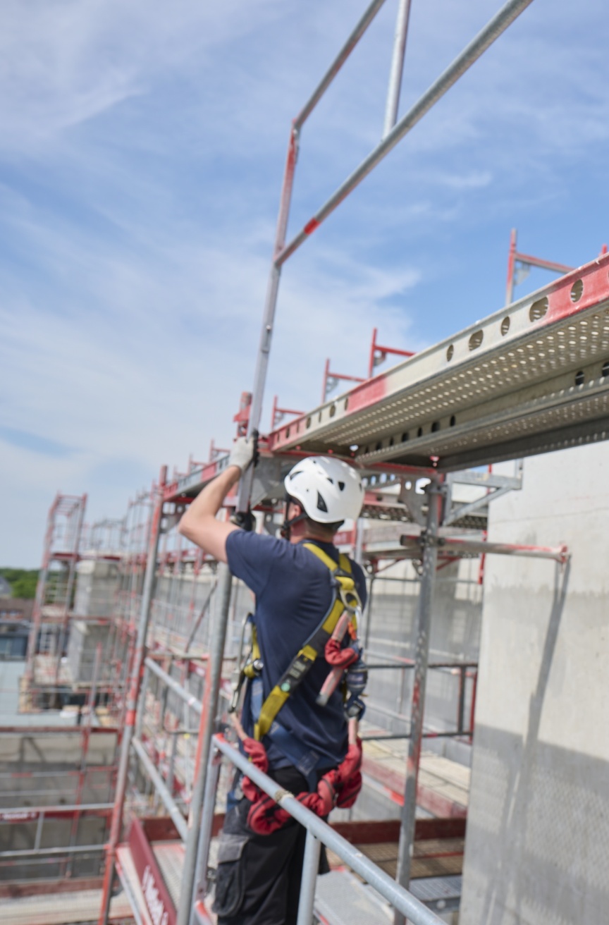 „Bei Rahmengerüsten war der sichere Aufbau häufig schwierig und nur mit zusätzlicher PSA möglich. Die aktuelle TRBS fordert allerdings neue Lösungen. Wir gehen in der Rangfolge der Schutzmaßnahmen nach dem TOP-Prinzip vor. Es beginnt mit hilfreichen „T“-echnischen Maßnahmen, wozu auch das eingesetzte Gerüstmaterial wie z. B. das I-Geländer gehört. Punkt zwei sind entsprechende „O“-rganisatorische Rahmenbedingungen, die wir mit vier eigenen Vollzeitsicherheitskräften geschaffen haben. Zuletzt kommen die „P“-ersönlichen Maßnahmen, die bei uns vor allem über das konsequente Tragen der PSA auf den Baustellen sichergestellt wird“, so der Gerüstexperte.