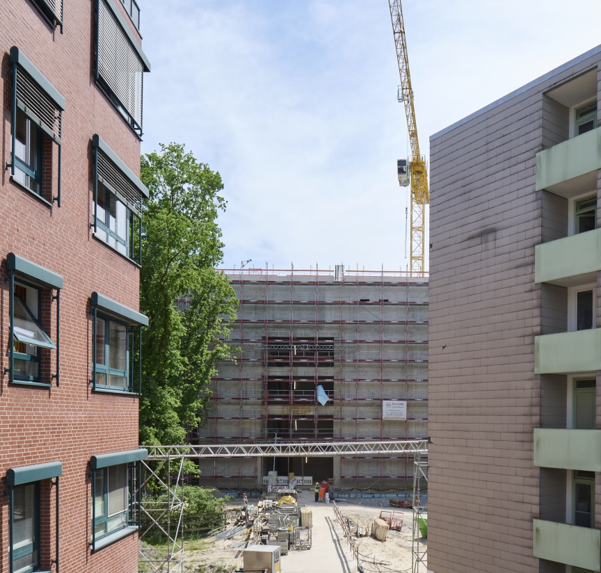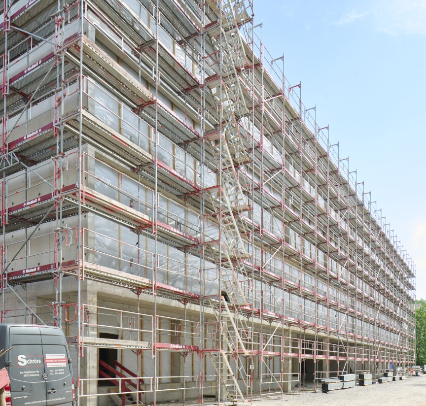 Um das Klinikum Oldenburg fit für die Zukunft zu machen, wurden auf dem Areal zwei große Neubauten erstellt. Ein fünfgeschossiger Erweiterungsbau und ein viergeschossiges Perinatal Zentrum mit insgesamt 370 Betten ergänzen die bestehenden Einrichtungen. Die Nietiedt Gerüstbau GmbH war schon beim Rohbau als Gerüstpartner involviert und hat für die Montage der vorgesetzten Fassade mit einer Kolonne von vier bis sechs Monteuren baubegleitend gut ca. 30.000 m2 Layher Blitz Gerüst mit I-Geländer aufgebaut. „Unsere Gerüstbauer sind umfassend in der Montage des I-Geländers geschult, daher ist auch eine so große Gerüstfläche kein Problem, ganz im Gegenteil“, erläutert Andreas Janssen, verantwortlicher Bauleiter für das Projekt. „Unsere Monteure müssen sich durch das vorlaufende Geländer beim Aufbau nicht mehr mit Ihrer PSA am Gerüst anschlagen, was zusätzlichen Bewegungsraum schafft, ohne die Sicherheit zu gefährden. Mit dem System verbinden wir demnach Effizienz und Sicherheit bestmöglich!“