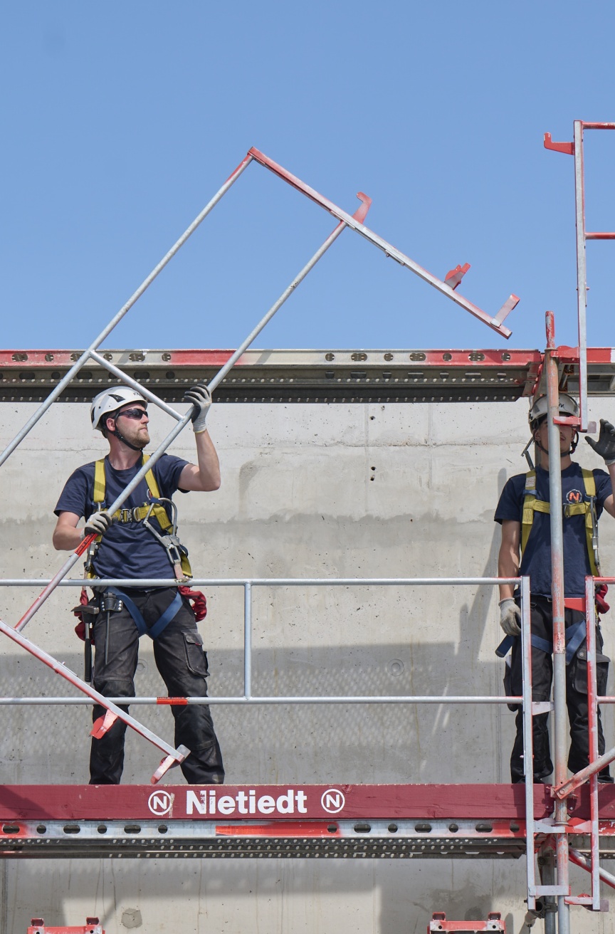 Die Nietiedt Gruppe hat ihre Anfänge in den 30-er Jahren des 20. Jahrhunderts und wuchs nach dem Krieg auf mittlerweile stattliche 600 Festangestellte an. Was als reiner Malerbetrieb begann, ist seit den Sechzigerjahren eine Gruppe aus vielen unterschiedlichen Gewerken und deutschlandweit 15 Standorten, die viele Leistungen rund um den Bau und Bautenschutz abdeckt. Die Gerüstsparte ist mittlerweile der größte eigenständige Teilbereich mit Hauptsitz auf dem beeindruckenden 3,6 ha großen Betriebsgelände am Ölhafen in Wilhelmshaven. Von hier sind die Gerüstbauer von Nietiedt im ganzen Bundesgebiet unterwegs. Schon zu Beginn arbeitete das Unternehmen ausschließlich mit den Gerüstlösungen von Layher. Der Name Nietiedt steht seit drei Generationen für Zusammenhalt, Qualität und Sicherheit und gehört mit technisch anspruchsvoller Handwerksarbeit zu den großen und modernsten Dienstleistern im Gerüstbau.