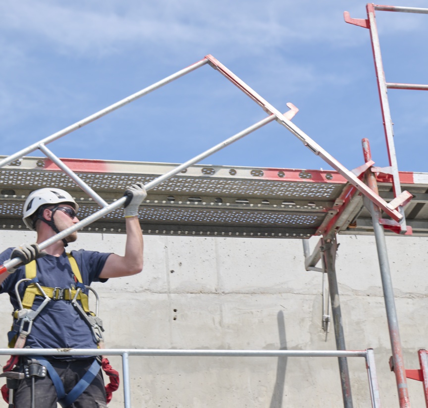 Das I-Geländer wird ganz einfach von unten aus der gesicherten Lage vorlaufend montiert. Danach erfolgt die Montage der Böden und man kann auf die gesicherte Lage aufsteigen. So kann bei den Gerüstbauern das Anschlagen der PSA entfallen. Durch das Aufstecken der nächsten Rahmen sind die Geländer und Böden dann gesichert. Durch eine passende, kranbare Materialpalette bilden Rahmen und passende Geländer eine Einheit und können platzsparend zusammen transportiert werden. Das I-Geländer lässt sich im eingebauten Zustand nicht mehr demontieren und schützt so nachfolgende Gewerke zuverlässig vor den Folgen einer unbefugten Demontage. Beim Einsatz des klappbaren I-Geländers kann dieses mit einem Spezialschlüssel geöffnet und nach unten geklappt werden, um z. B. Material in das Gerüst oder Gebäude einzubringen. So ist die Materialbestückung der Baustelle auch am fertigen Gerüst möglich.