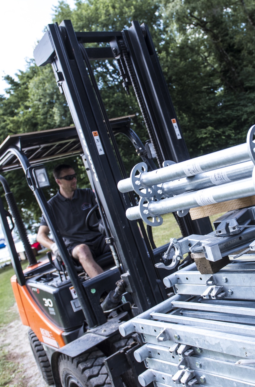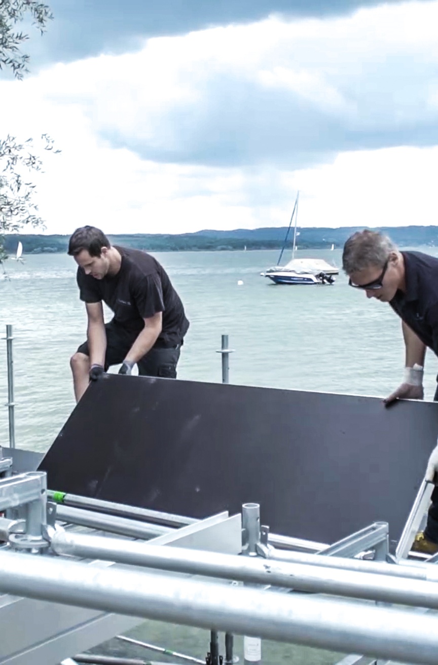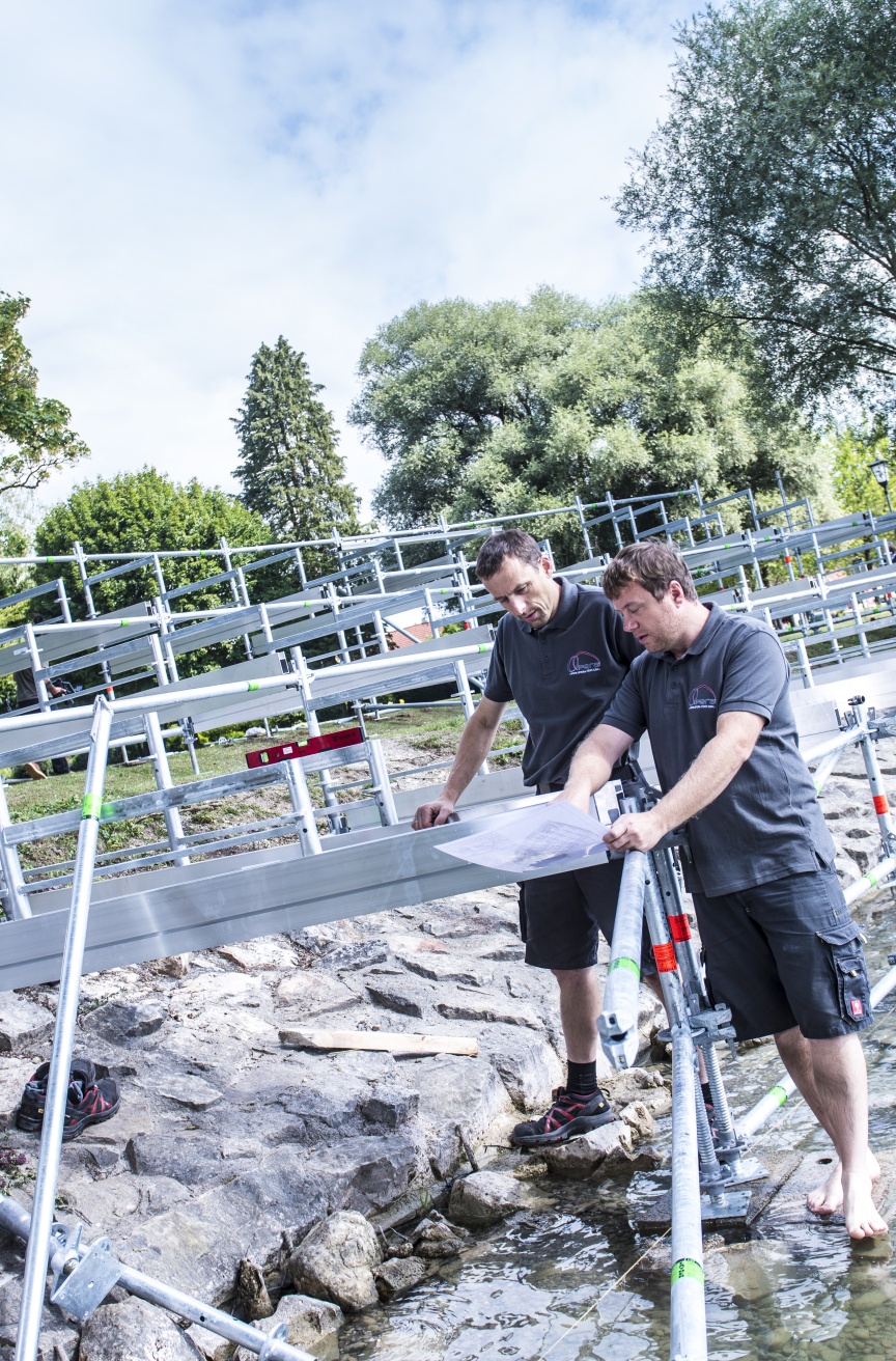 Die Schauspielerinnen und Schauspieler auf der Uttinger Seebühne spielen traditionell ganz ohne technische Verstärkung, was bei einem Open Air Event wie hier direkt vor bzw. in der malerischen Kulisse des Ammersees auch für den Tribünenbau Auswirkungen hat. „Wir haben die gesamte Konstruktion wie ein Amphitheater angelegt, in dem sich der Schall fängt, damit möglichst jeder Besucher optimal verstehen kann. Zudem steht die Tribüne mit den vordersten Stützen direkt im Wasser, um den Besuchern das Gefühl zu vermitteln, sie würden auf dem See sitzen – so bekommt das Stück ‚Im Weißen Rössl (am Ammersee)‘ einen zusätzlichen Reiz“, erklärt Stefan Dankel. Diese besondere Form konnten die Layher Techniker für Event durch die Kombination aus Standard- und Sonderbauteilen realisieren. Die Unterkonstruktion besteht dabei aus dem Layher AllroundGerüst, das sich durch eine hohe Tragfähigkeit und den schnellen und flexiblen Auf- und Abbau auszeichnet. Nicht nur die Tribüne bekommt in Utting nasse Füße, auch das sechsköpfige Team stand beim Aufbau im angenehm kühlen Wasser des Ammersees, um das Bauwerk richtig auszurichten.