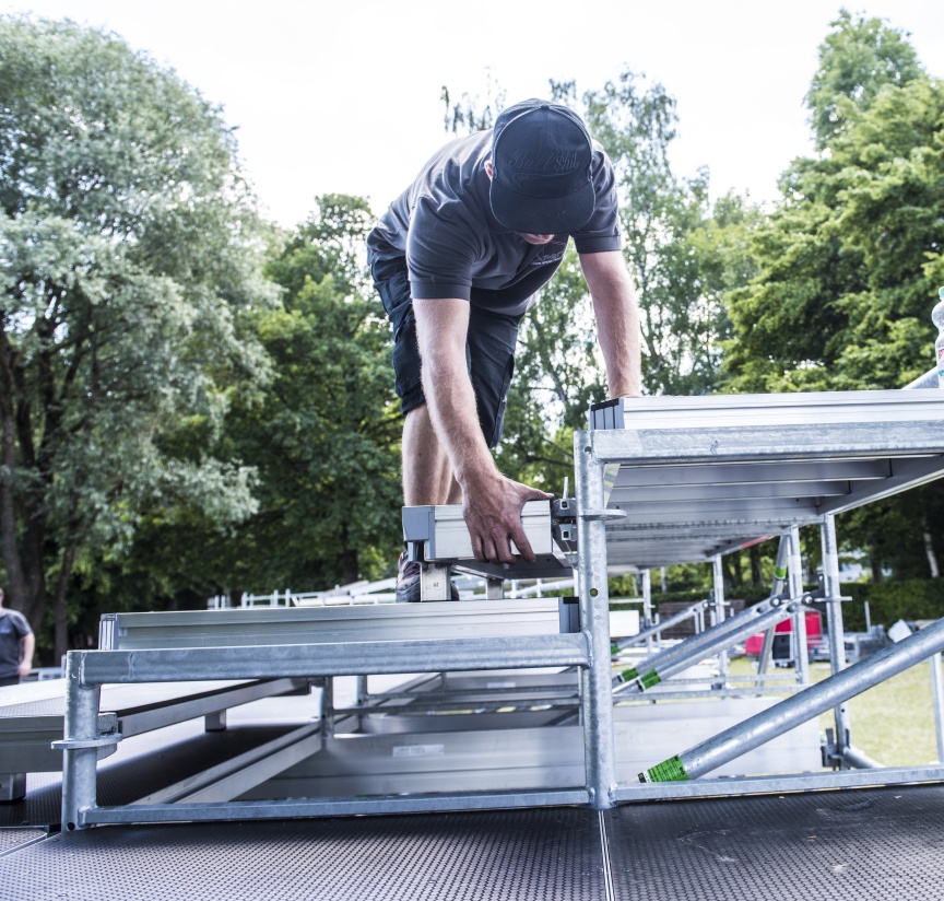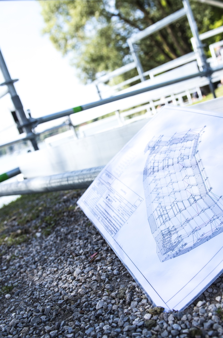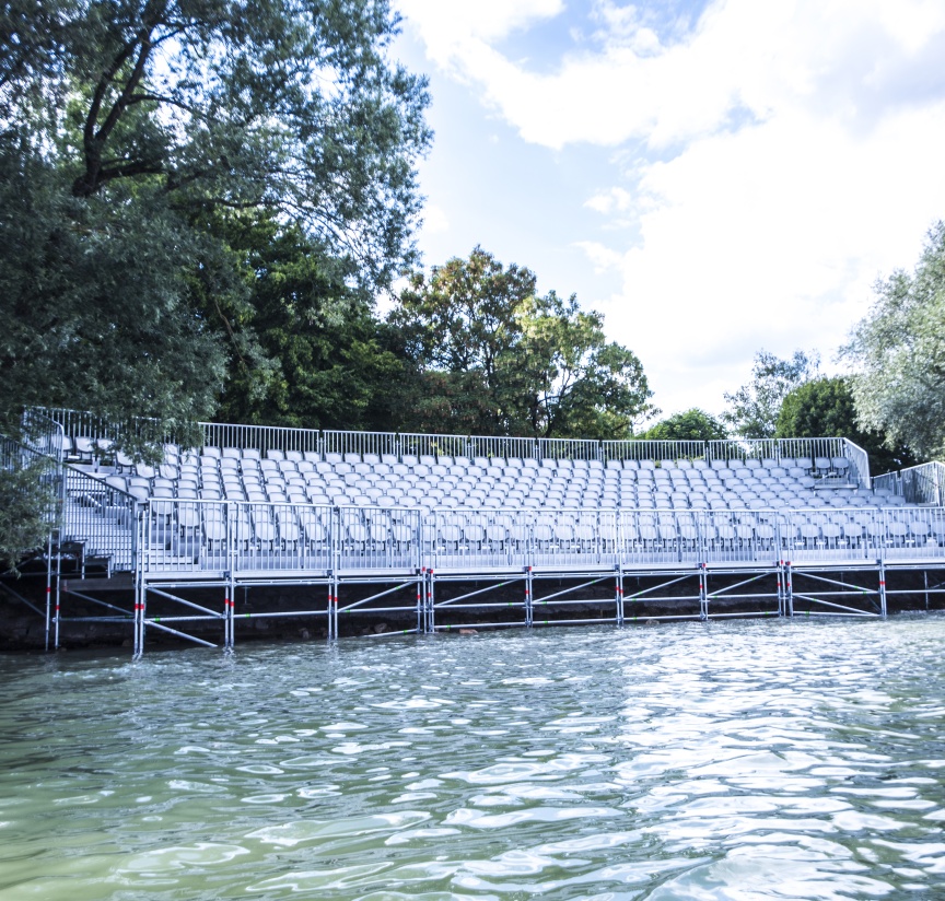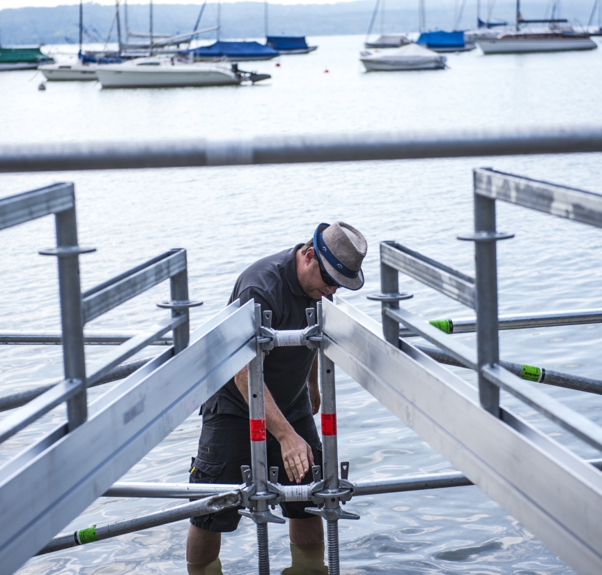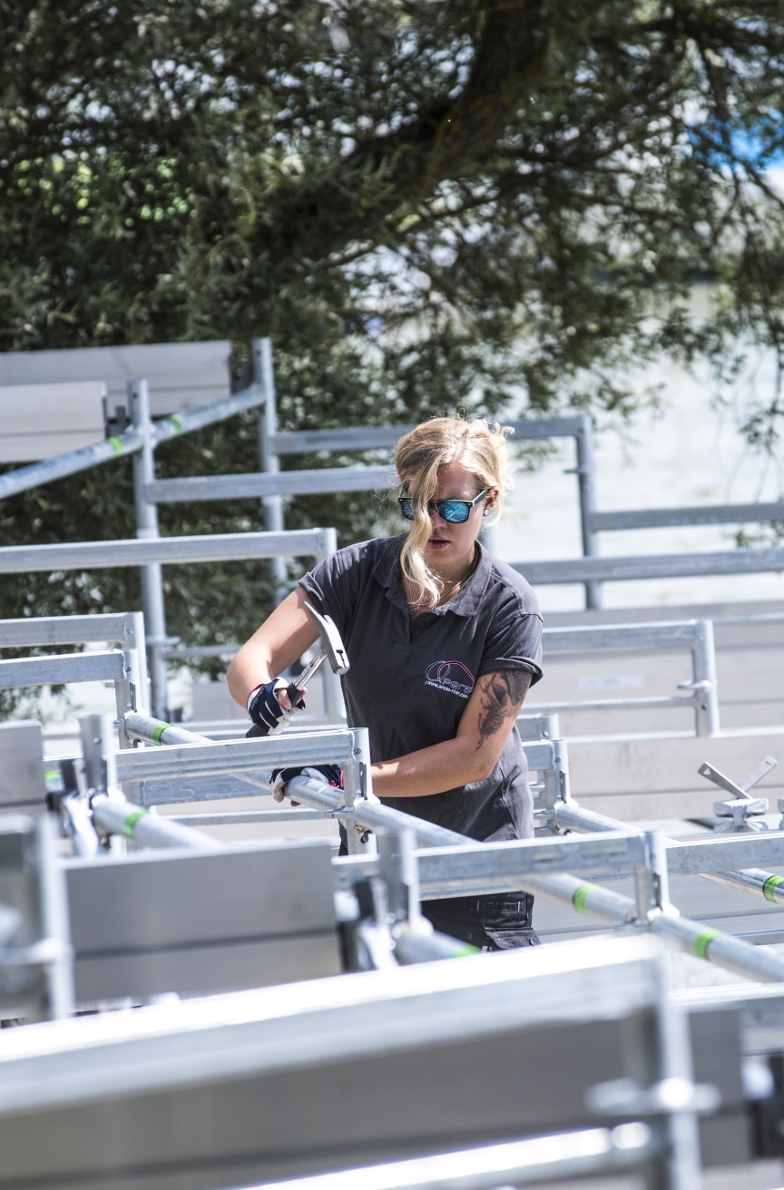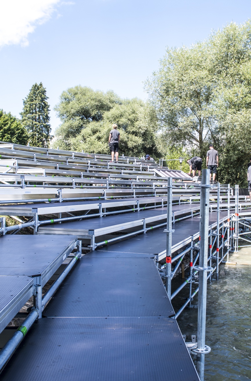 Korrosionsbeständige, feuerverzinkte Stahlbauteile ermöglichen die Gründung der Tribüne im Wasser. „Wir bauen in diesem Jahr das erste Mal eine Tribüne mit dem Layher Material und sind sehr froh, dass uns die Techniker und der Außendienst von Layher hier vor Ort so tatkräftig unterstützen. Auch die extra für diesen Event geplanten und produzierten Sonderteile haben alle auf Anhieb gepasst,“ ergänzt Johannes Dankel.