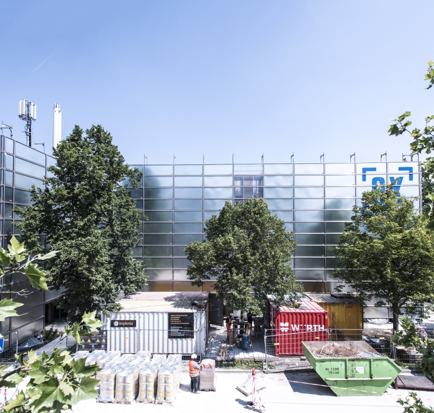 Aber nicht alleine der Lärm – Geräuschemissionen werden mit dem Layher Protect-System um immerhin 26 dB gemindert – auch der spritzende Betonschlamm war für den Bauherren Grund genug, das gesamte Gebäude vor Beginn der Arbeiten komplett einhausen zu lassen. „Unser Auftraggeber hat schon in der Ausschreibung ganz explizit das Layher Protect-System angefragt, weil er damit gute Erfahrungen gemacht hat und ihn darüber hinaus auch die Optik der Fassade überzeugt“, erläutert Eipper. Das System schütz dabei die Baustelle vor Witterungseinflüssen und die Umgebung vor Staub, Lärm oder herabfallenden Gegenständen. Direkt neben der Baustelle befindet sich ein hochfrequentiertes Kundencenter, dessen Besucher durch die Protecteinhausung der Baustelle ebenfalls vor Staub und Lärm geschützt werden.