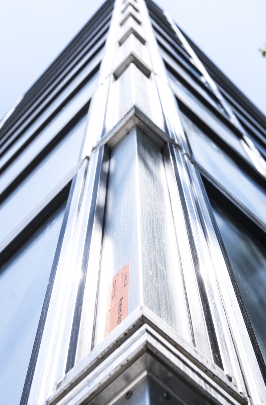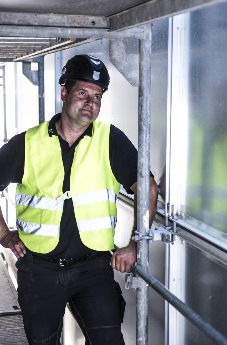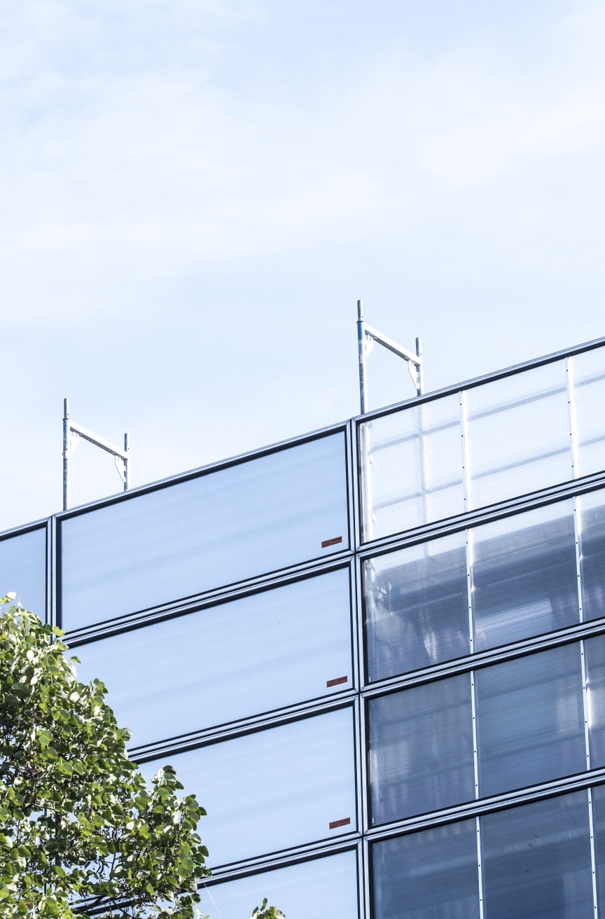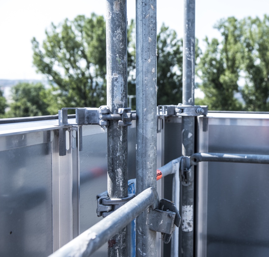 2 große Fassadengerüst aus Layher Blitz Gerüst zu stellen, das in diesem Fall als Basis für die Protect-Platten dient, die maßlich in das System passen. Die Gerüstbauspezialisten mussten sehr genau arbeiten und das gesamte Grundgerüst mit dem Laser absolut lotrecht aufstellen. Projektleiter Eipper erklärt dazu „Das Protect-System schließt, wenn es richtig aufgebaut ist, staubdicht und ohne jeden Spalt. Das gelingt aber nur, wenn das Gerüst absolut gerade ist.“ Nur 6 weitere Tage brauchte das sechsköpfige Team, um die Protect-Kassettenelemente zu montieren. Hierbei muss fortlaufend von einer Ecke des Gebäudes aus gearbeitet werden, um die Fassade wirklich gerade und dicht zu bekommen. Für diese Baustelle kamen sowohl die Protect-Rahmenelemente aus verzinktem Stahlblech wie auch die Varianten mit lichtdurchlässigen Kunststoff-Stegplatten zum Einsatz.