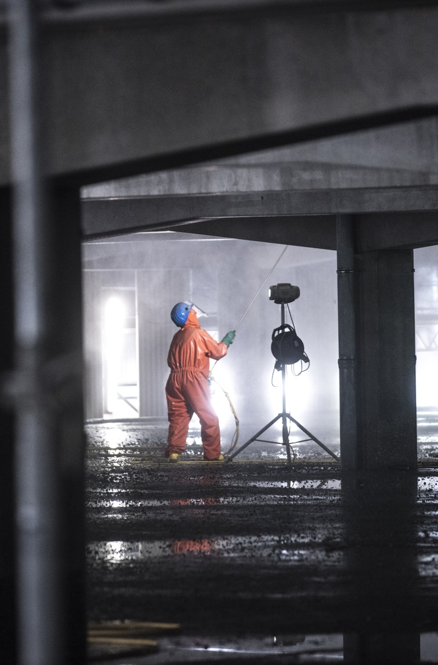 Normalerweise herrscht in diesem Parkhaus tagsüber schläfrige Ruhe. Die Schichtarbeiter sind in den Werkshallen verschwunden und haben ihre Wagen hier geschützt abgestellt. Wenn Armin Eipper, Projektleiter der QuadreX Gerüstbau GmbH, allerdings in diesen Tagen seine Baustelle besucht, wartet infernalischer Lärm auf ihn. Die Arbeiter sanieren mit einem Höchstdruck-Wasserstrahl den Beton. Das ist ohne professionellen Gehörschutz nicht auszuhalten.