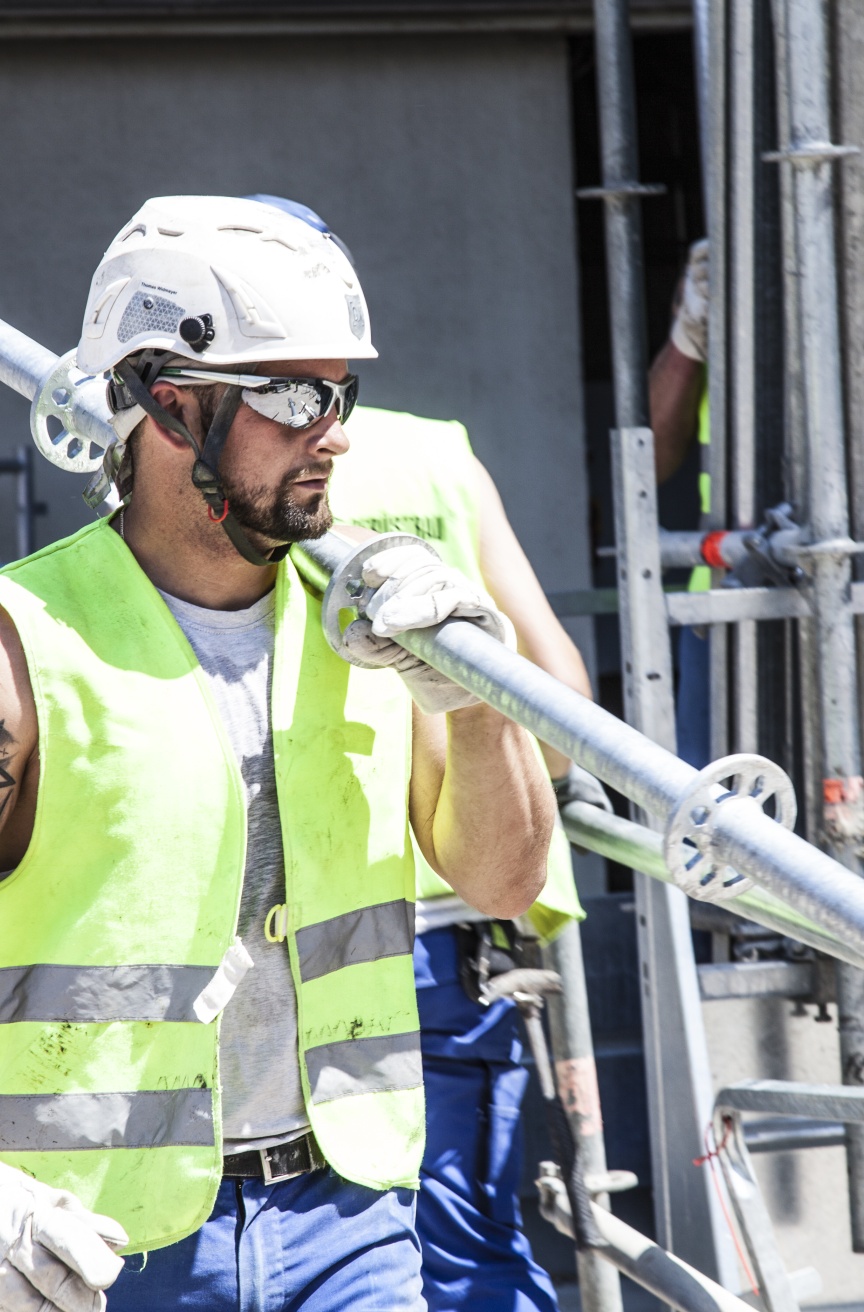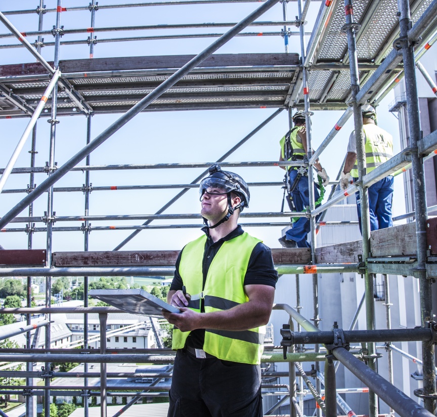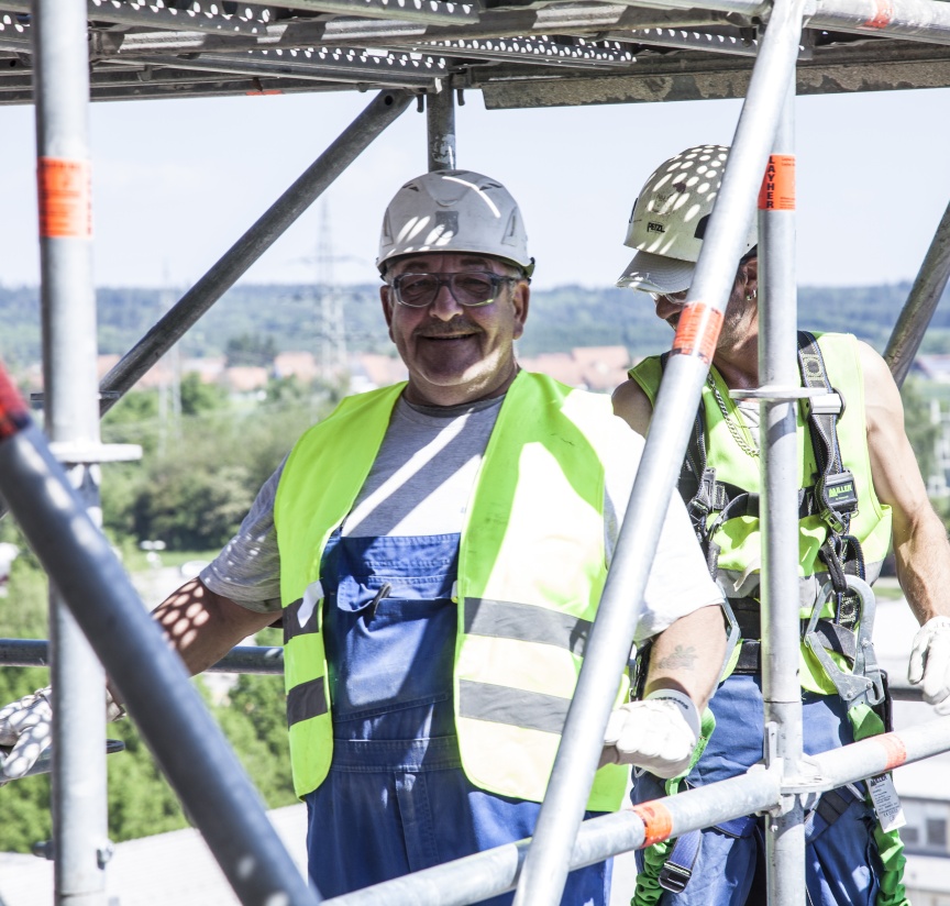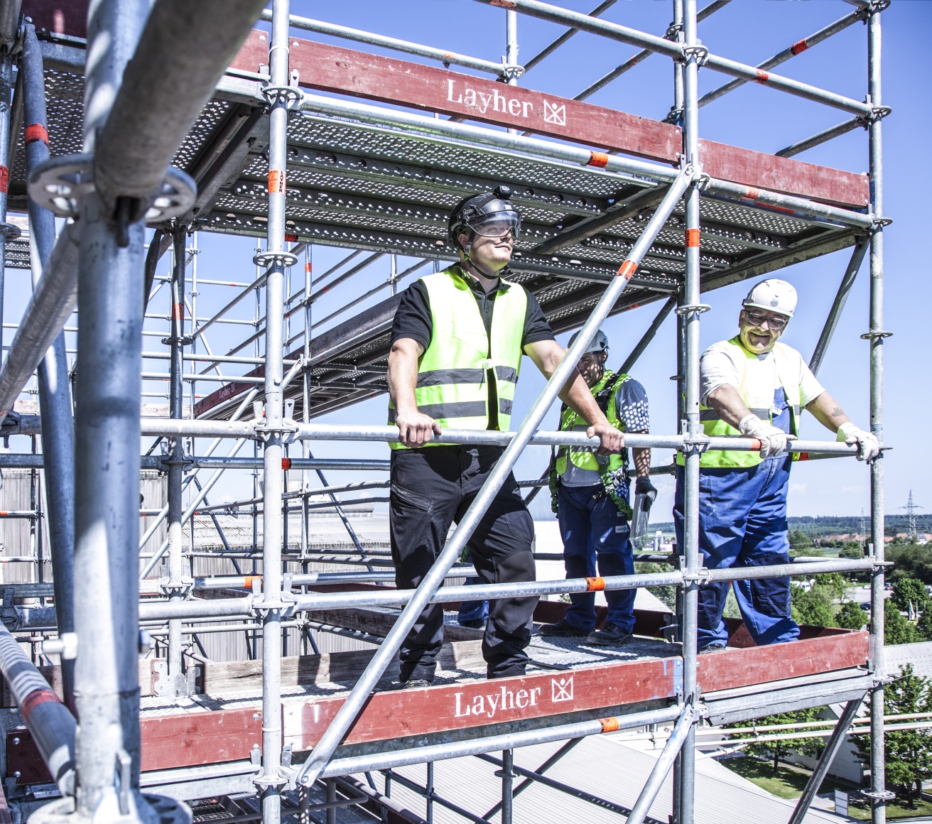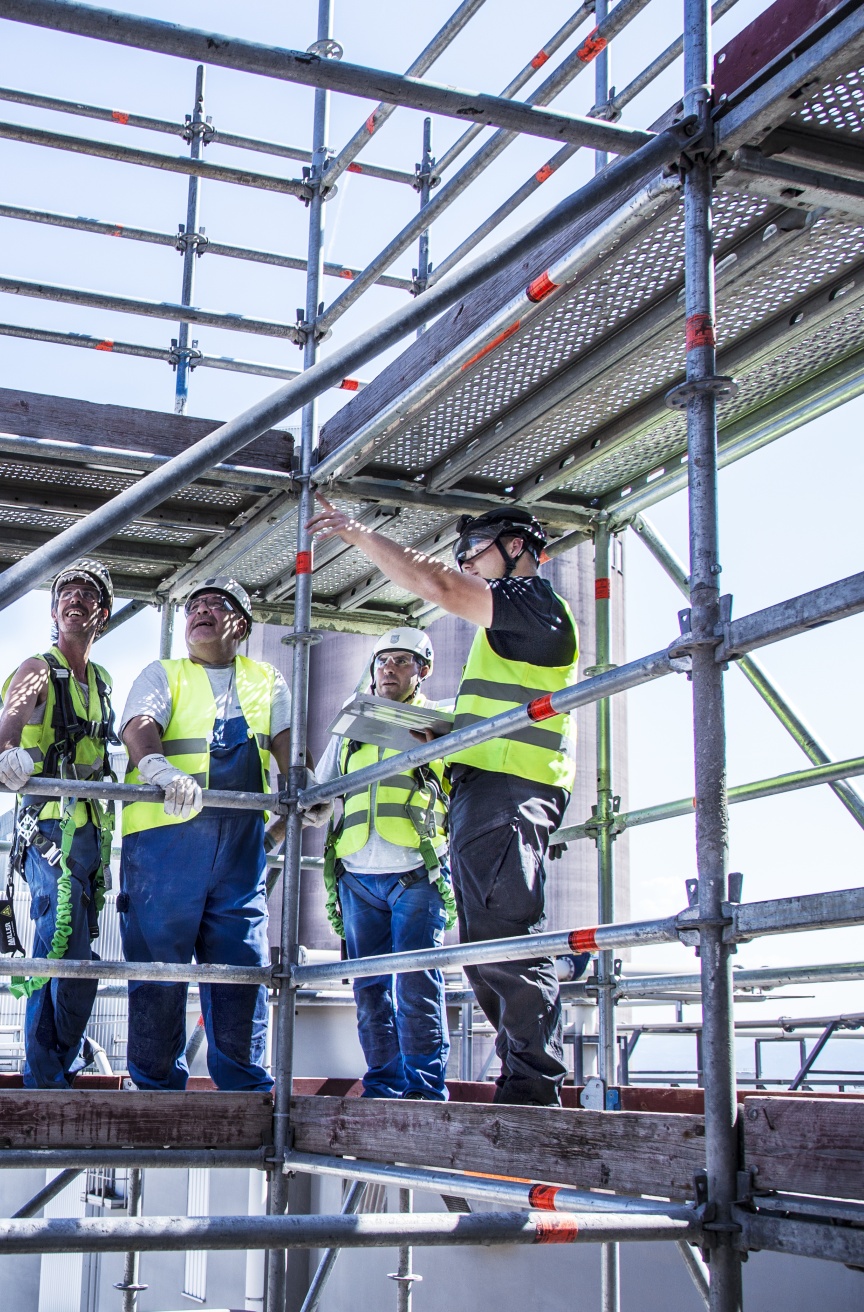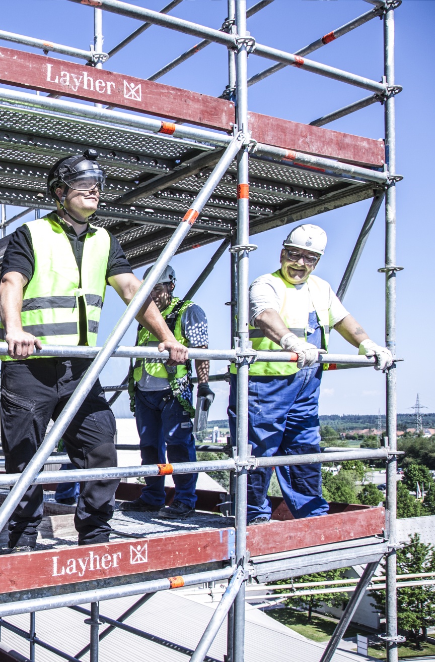 Wenn man die Gerüstspezialisten von QuadreX beobachtet wird sehr schnell klar, dass diese Arbeit nur von extrem gut geschulten Mitarbeitern erledigt werden kann. Beim Materialhandling unter diesen Extrembedingungen ist zudem das Gewicht der Einzelteile ein entscheidender Faktor. Mit den Lightweight Allround-Bauteilen lässt sich hierbei einfacher und sicherer arbeiten. Jeder einzelne Arbeitsschritt will gut überlegt sein, um die eigene Sicherheit nicht zu gefährden. „Wir schicken unsere Männer regelmäßig auf Schulungen zu Layher, um sicherzugehen, dass alle aktuellen Arbeitssicherheits-Vorgaben bekannt sind und jeder im Team weiß wie man ein Gerüst sicher stellt“, ergänzt Postweiler, der selbst seine Ausbildung zum Gerüstbauer als Jahrgangsbester abgeschlossen hat.