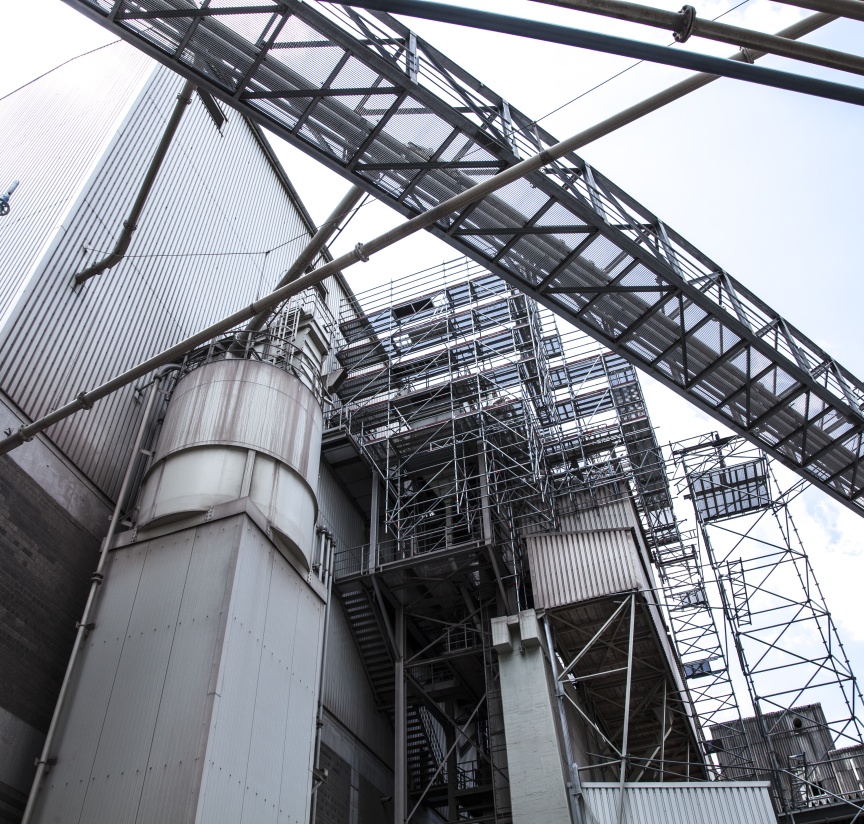 Projekt 1 auf dem Areal war die teilweise Einrüstung einer Materialmühle auf ca. 40 Metern Höhe für die Revision und den späteren Bau einer Einhausung. Hier mussten die Spezialisten von QuadreX mit dem Layher AllroundGerüst Material eine Überbrückungskonstruktion aus AllroundGerüst und Gitterträgern planen und bauen. Zur Unterstützung wurde ein Allround-Turm als Traggerüstkonstruktion gestellt. „In der Anlage herrscht viel LKW-Verkehr, daher müssen wir darauf achten, mit unseren Aufbauten so wenig Platz wie möglich am Boden zu belegen. Mit unserem Allround Material haben wir das Ganze in kürzester Zeit geschafft und so Arbeitszeit sowie am Ende Lohnkosten gespart“, erklärt der Gerüstbauer sein Konzept. Das Layher AllroundGerüst bietet durch die bewährte Kombination von Form- und Kraftschluss und den einfachen Aufbau dank AutoLock-Funktion beste Voraussetzungen.