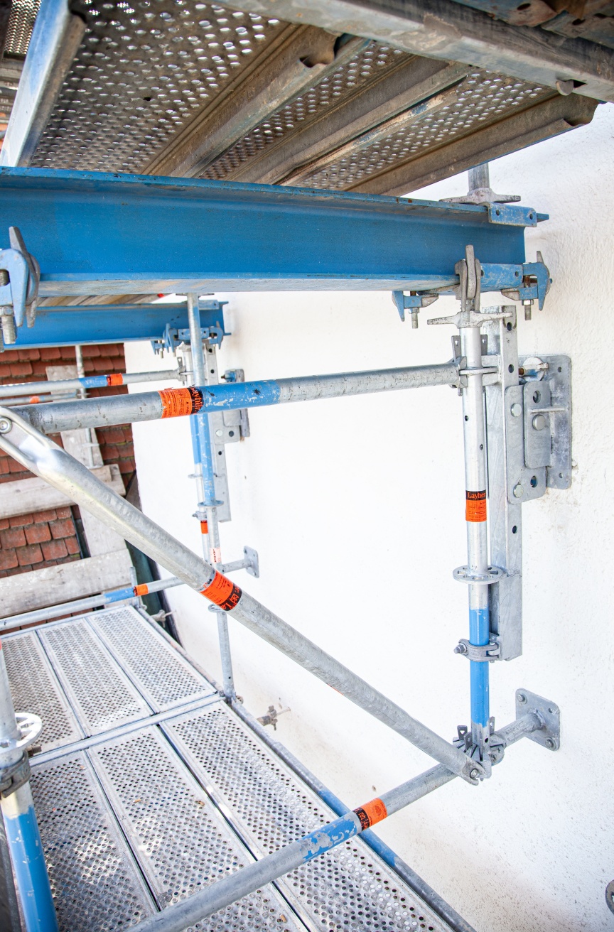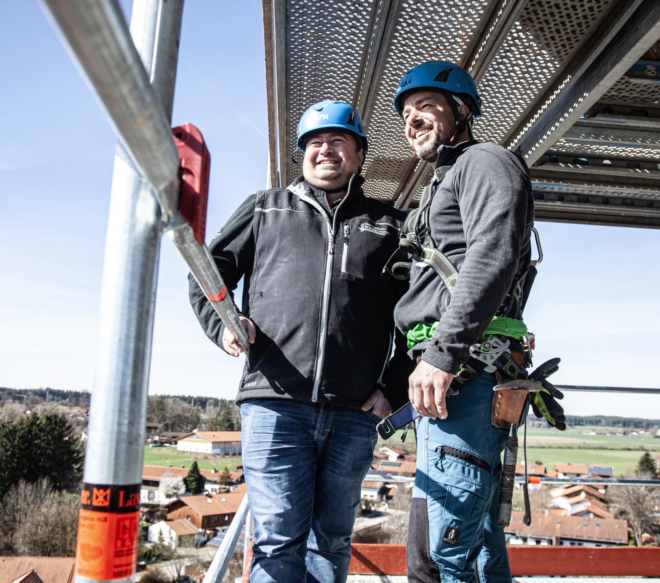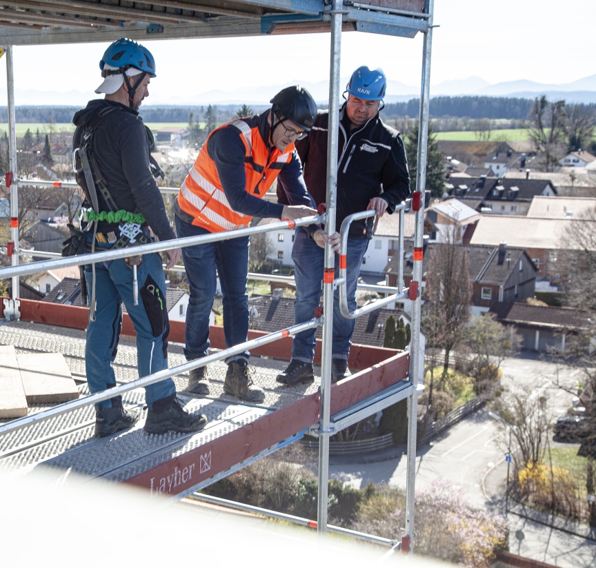 „Um es gleich zu Beginn einmal zu sagen, das AGS System hat uns sowohl in puncto Handhabbarkeit als auch in puncto Kombinierbarkeit mit unserem anderen Layher Material überzeugt – wir werden das definitiv auch bei unseren nächsten Projekten einsetzen“, so der Geschäftsführer Franz Westermaier Junior im Gespräch mit unserem Gebietsverkaufsleiter Ardian Gashi. Um den aktuellen Sicherheitsvorgaben zu entsprechen, wurde von den bayerischen Gerüstbauern das modulare Fassadengerüstsystem AGS von Layher eingesetzt, das mit seinem AGS-Stiel und dem AGS-Geländer den Aufbau aus gesicherten Lagen ermöglicht. Den Zugang und Materialtransport ermöglichen ein vorgesetzter Podesttreppenturm und ein zusätzlicher Gerüstbaulift.