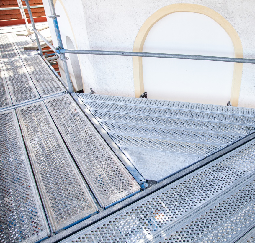 Durch die vollständige Integration des AGS Systems in das Layher AllroundGerüst können alle Systembauteile verwendet werden. In Otterfing ist der obere Teil des Turms z. B. achteckig ausgeformt. Die entstehenden Ecken wurden daher sehr unkompliziert mit U-Stahlböden 45° geschlossen. Durch die unklare Statik des Turms musste der obere Gerüstteil zudem mit Allround Wandkonsolen an der 1,3 m dicken Turmmauer abgelastet werden. Mit passenden Innenkonsolen aus dem Allround Baukasten wird das Gerüst der Form der Turmspitze Schritt für Schritt angepasst, um bis zur Turmspitze zu gelangen und auch diese sanieren zu können.