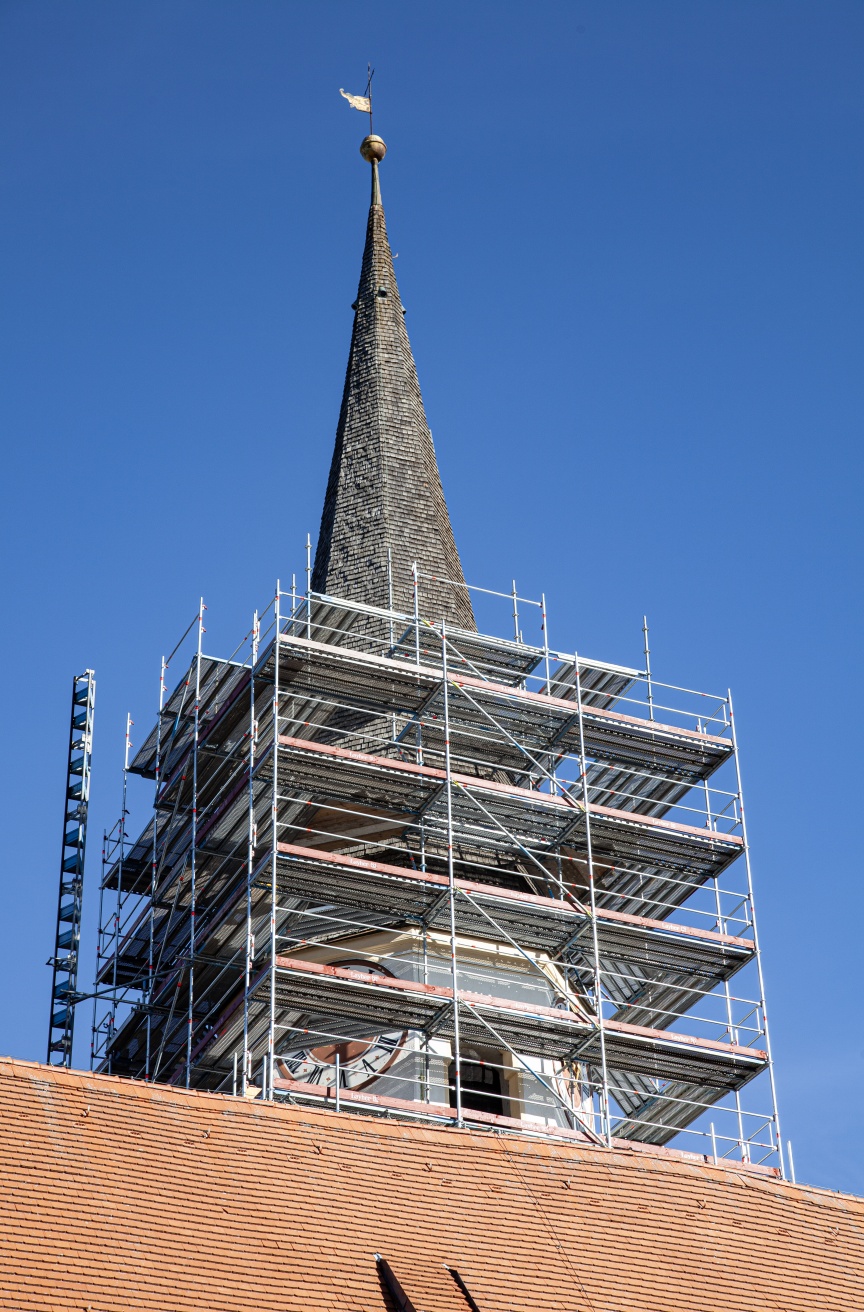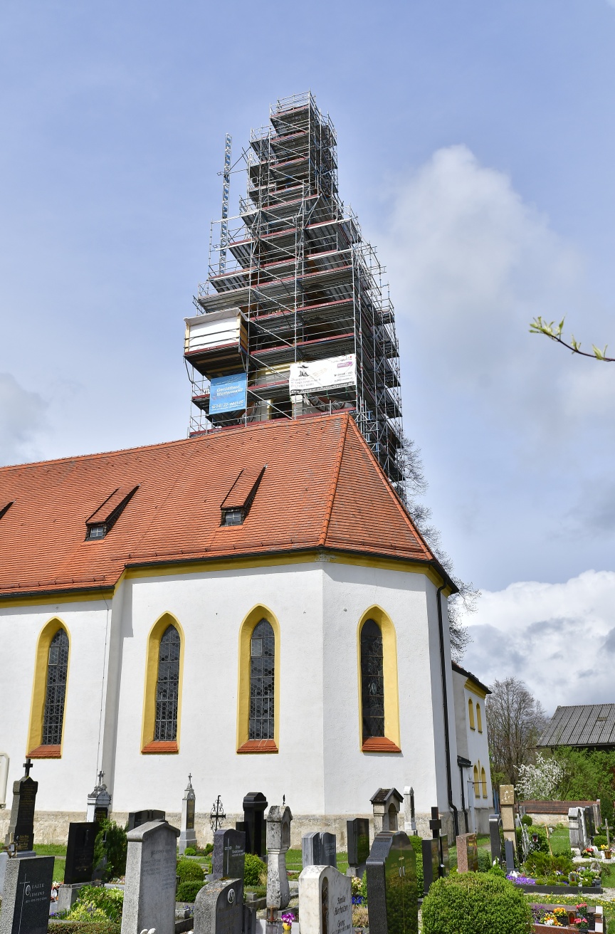 Die Gemeinde Otterfing ist das nördliche Tor zum Landkreis Miesbach und liegt zwischen München und den Alpen, die bei entsprechendem Wetter auch zum Greifen nah scheinen. Die katholische St. Georg Kirche der Gemeinde im spätgotischen Stil um 1530 steht mit ihrem 40 Meter hohen Glockenturm inmitten des Friedhofs und überragt die 5.000 Seelen Gemeinde weithin sichtbar. Das Dach des Turms bedarf einer Generalsanierung, da das Wetter und der Specht den Holzschindeln über die Jahre sehr zugesetzt haben. Die Spezialisten der Firma Gerüstbau Westermaier GmbH um die beiden Geschäftsführer Franz Westermaier Senior und Franz Westermaier Junior aus dem gut 60 km entfernten Bockhorn, haben in den vergangenen Jahren diese Gerüstbauaufgabe schon bei vielen vergleichbaren Objekten in der Region übernommen. Besonderheit in Otterfing war ein 3D-Laserscan als Planungsgrundlage und der erstmalige Einsatz von rund 40 t des modularen Fassadengerüstsystems AGS von Layher.