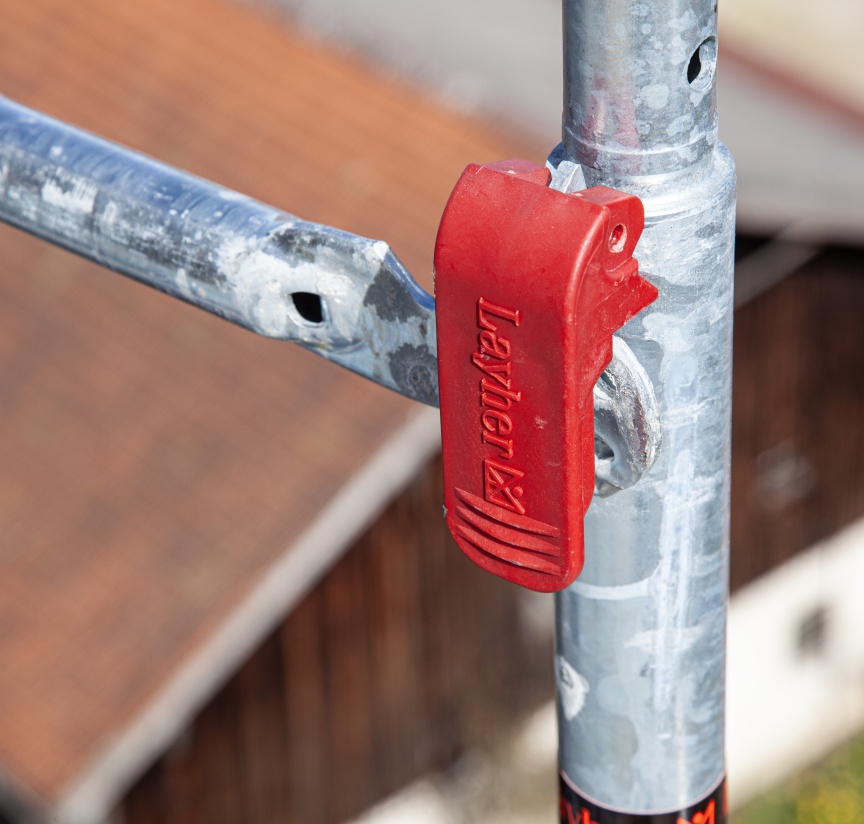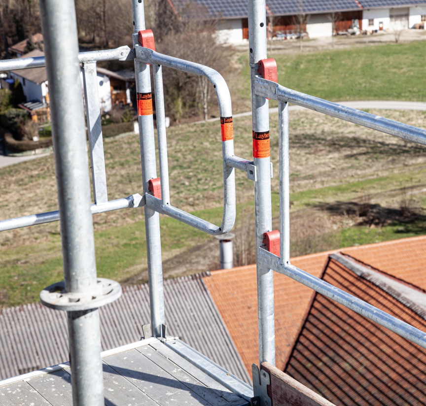 Die roten Bügel am AGS-Geländeranschluss dienen der werkzeuglosen Fixierung des Geländers bei der Montage und bleiben während der vorlaufenden Montage und Demontage aus gesicherter Lage geschlossen. Durch das Öffnen des Bügels lassen sich die in Otterfing eingesetzten AGS-Geländer beim fertigen Gerüst auch schnell, einfach und werkzeuglos demontieren, um z. B. die Materialbestückung der Baustelle oder die Demontage der Glocke zu ermöglichen. Wenn das aus Sicherheitsüberlegungen nicht gewünscht ist, lassen sich mit dem AGS-Geländer Fixx auch nicht demontierbare Geländerlösungen realisieren. Das passende AGS-Doppelstirngeländer sichert die offenen Stirnseiten des AGS Systems und lässt sich auch vorlaufend, schnell und einfach aus der gesicherten Lage ohne zusätzliche Kupplungen montieren.