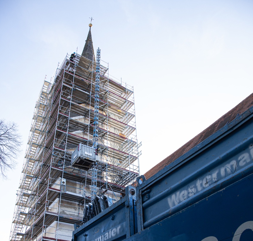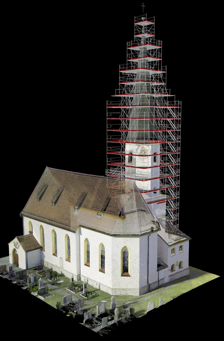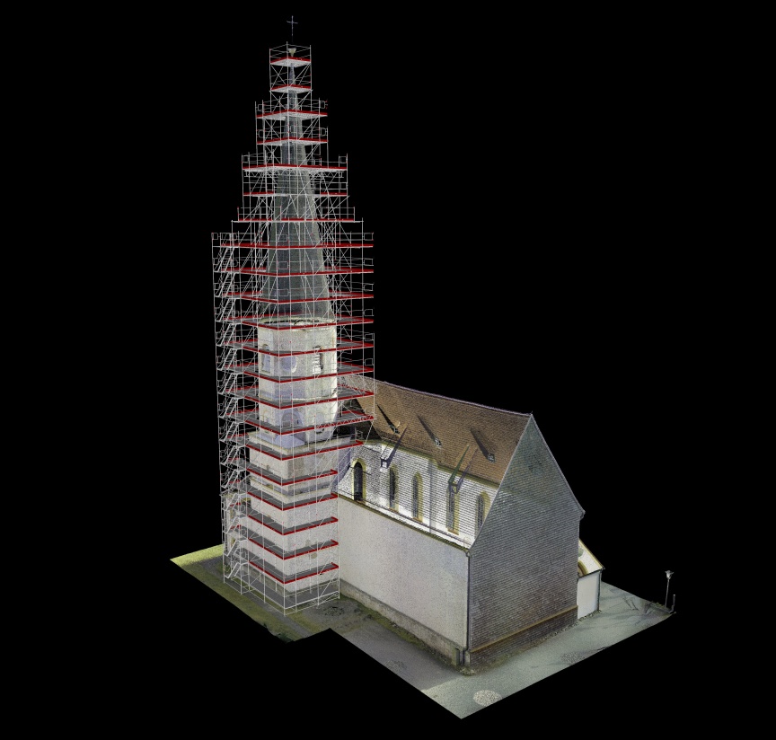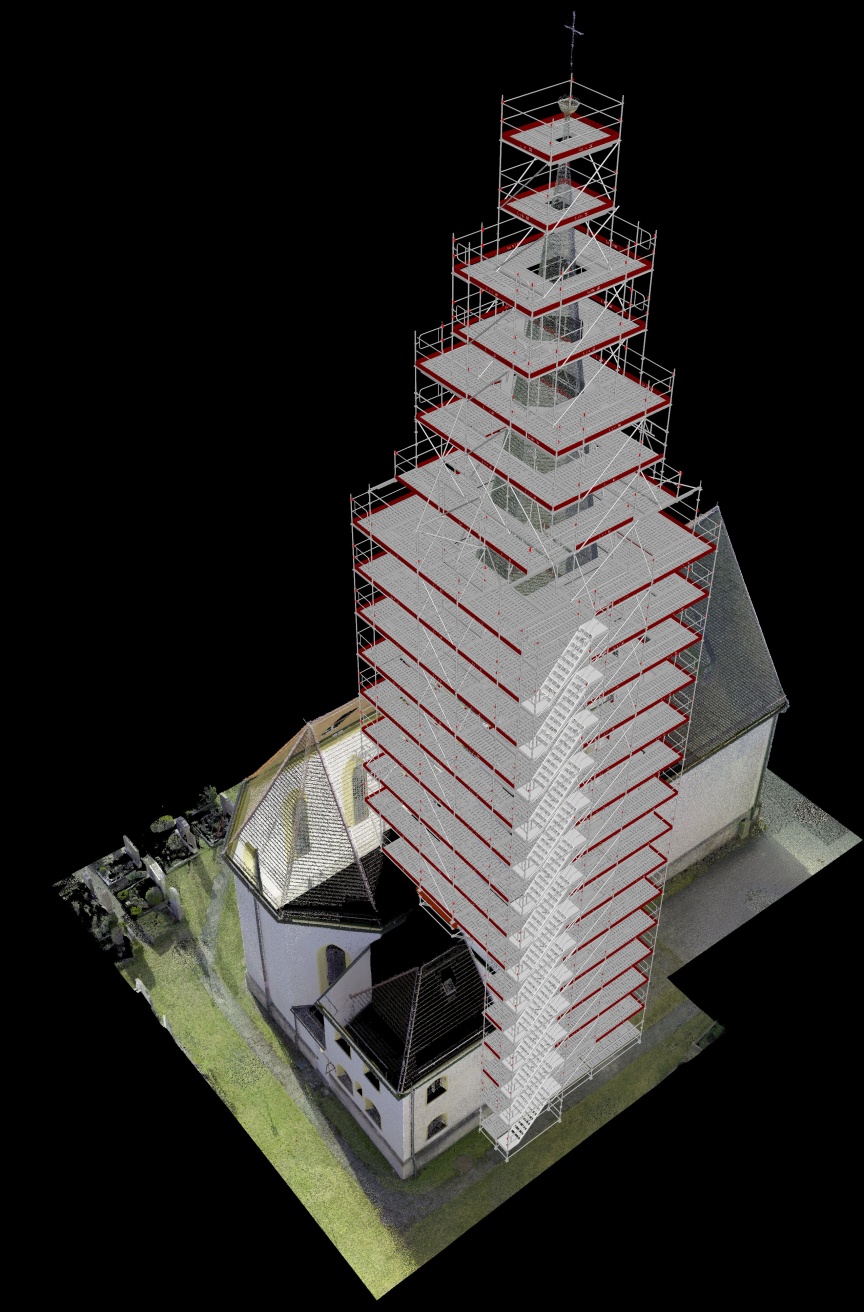 „Wie bei vielen historischen Gebäuden gibt es auch für die Kirche in Otterfing keine verlässlichen Pläne und Statiken“, erläutert der Geschäftsführer. „Gemeinsam mit Layher haben wir uns daher entschieden, die Kirche von Layher 3D-Laserscan Spezialisten aus Eibensbach als Planungsbasis scannen zu lassen.“ Auf Basis dieser Daten wurde ein digitaler Zwilling erstellt und das Turmgerüst in LayPLAN CAD in 3D bis ins Detail geplant. „Damit sind wir sowohl bei der Materiallogistik als auch beim Aufbau deutlich effizienter und vermeiden zuverlässig unvorhergesehene Überraschungen auf der Baustelle“, betont Franz Westermaier Junior. „Gerade bei historischen Gebäuden kommt es immer wieder dazu, dass das, was wir an Gebäudestruktur vorfinden, mit den ursprünglichen Plänen nichts oder nur sehr wenig zu tun hat … wir müssen dann in der Situation flexibel reagieren, was Zeit und Geld kostet und nur aufgrund der vielen Standardbauteile des AllroundGerüst überhaupt möglich ist.“