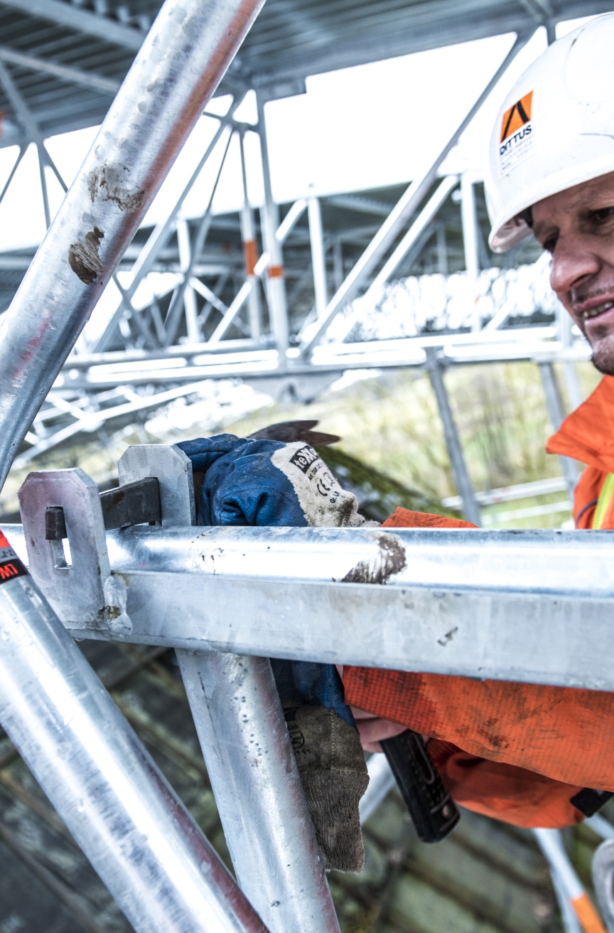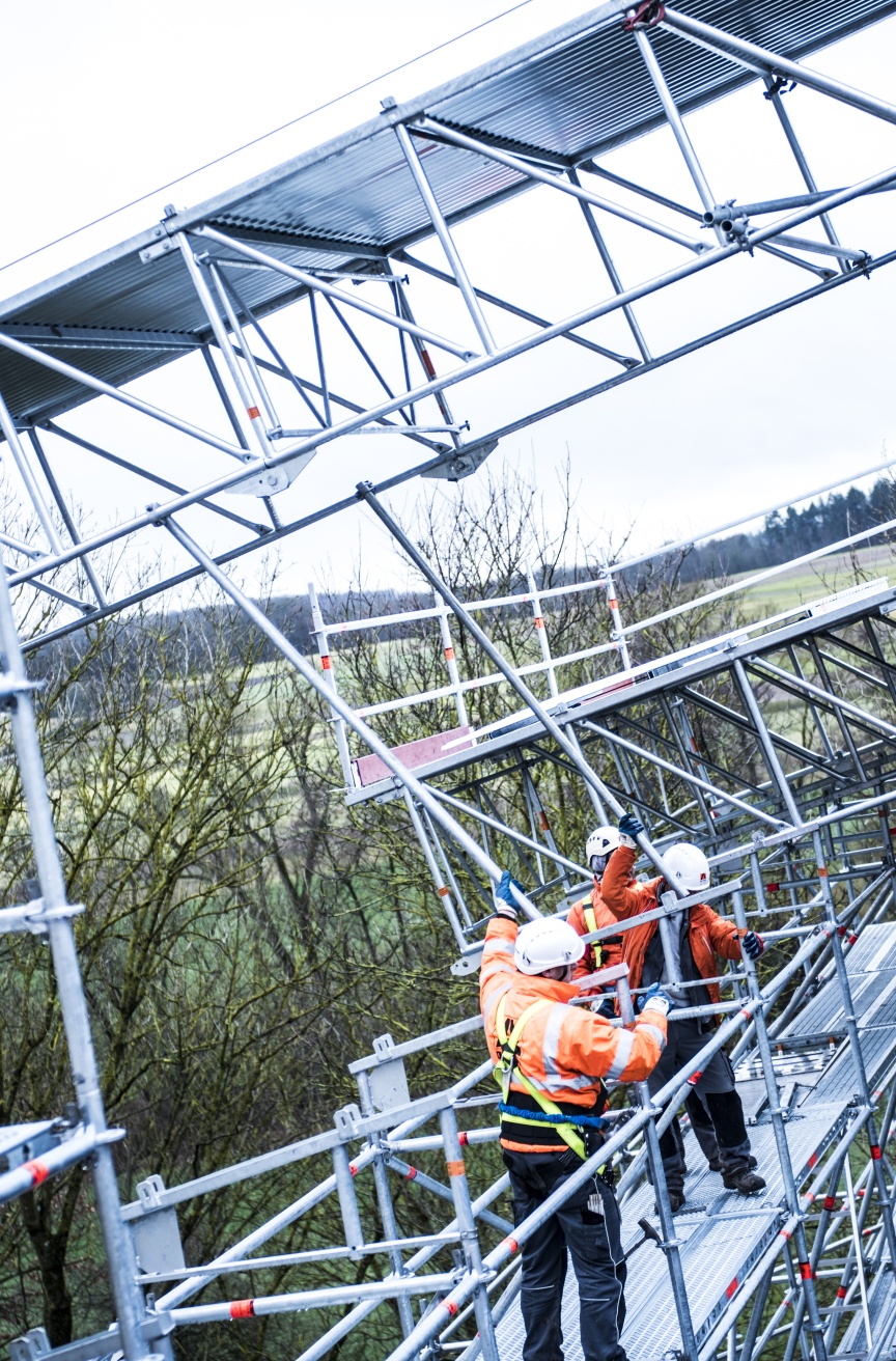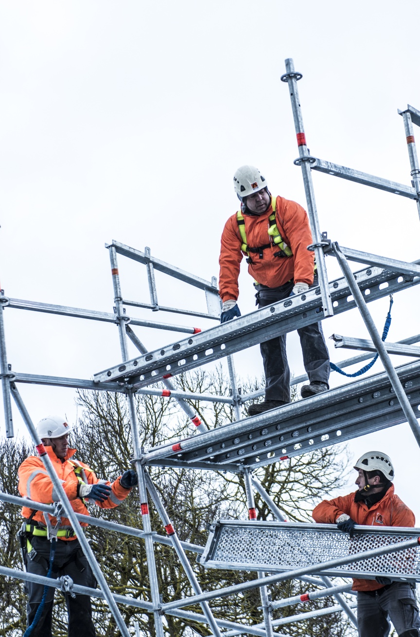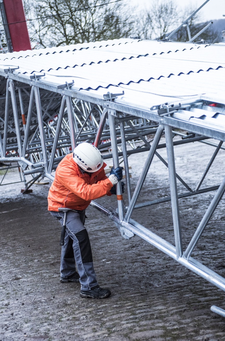 The Layher Cassette Roof consists of a truss substructure with corrugated iron cassettes on top, which are easily secured using wedges and clamping plates. Transparent cassette elements are also available to provide additional daylight to the construction site. The individual components are fitted with convenient handles that allow assembly by only two workers from a secured position. Individual cassette elements can be removed to allow for access, i.e. for bringing in building materials. The structure can be walked on and will withstand snow load. The Layher Cassette Roof solution can be mounted on both the Layher SpeedyScaf as well as the Allround System and not only offers protection for construction sites, but is also a quick and straight-forward solution for temporary hall constructions when combined with the Layher Protect System. “One of the major advantages of the systems offered by Layher is their great flexibility and range of available standard components, which allowed us to complete most of our projects without any expensive or time-consuming custom solutions”, Dittus explains from the perspective of an experienced scaffolding expert.
