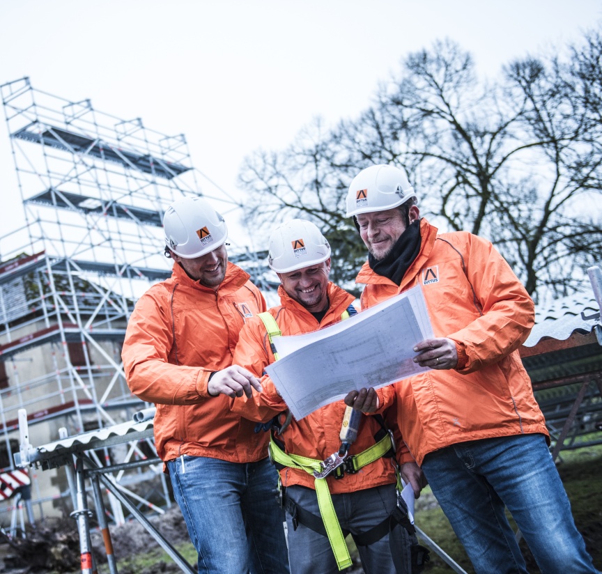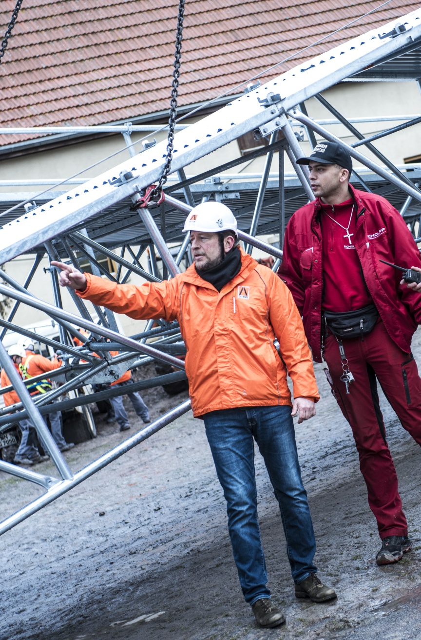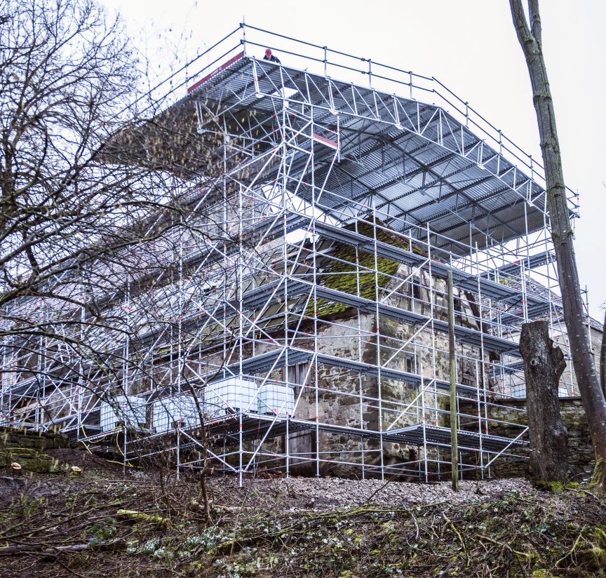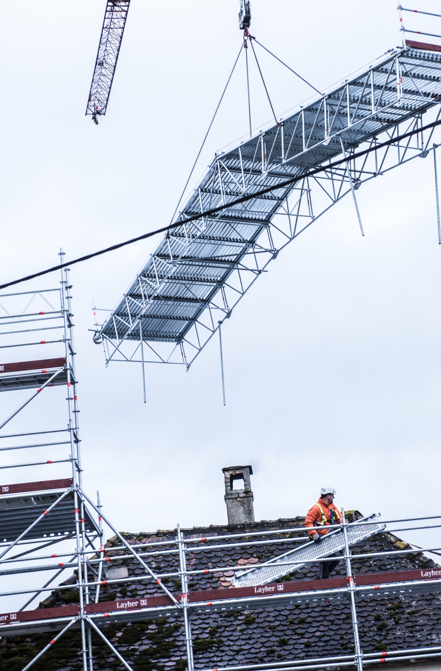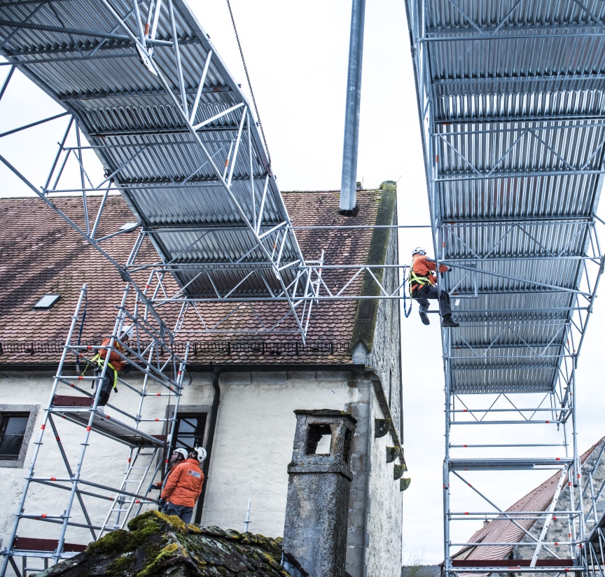Dittus commissioned a team of five workers to erect an Allround Scaffolding around the former monastery chapel that is structurally connected to the blacksmith building. The entire planning of the scaffolding and roof for this special project was prepared by the Layher Technical Department. The fact that the walls of chapel and blacksmith buildings were interlocking called for a solution that would allow the protective roof structure to rest on one side of the Cassette Roof without additional support. This requirement was solved by an additional transverse-mounted lattice girder to provide dedicated support for the roof truss. Additionally, the cantilever scaffolding was secured against wind impact by a wider footing and additional ballast. The six truss bays with a weight of 1.6 tons and a width of 17 metres each, which had safely been pre-assembled on the ground, were fitted at height using a mobile 60-ton folding crane, which allowed the scaffolding workers to mount the parts quickly and precisely on the prepared Allround substructure. It didn’t take long for the Layher material to once again prove its outstanding flexibility when the specialists were tasked to build around a protected tree that could not be pruned. Temperatures around freezing point with intermittent soft hail were an additional challenge to the occupational safety of the workers on the roof fields. They used a safety rope, which ran across the whole length of the trusses and allowed them to work safely and without their movements being obstructed by annoying safety equipment attached to them.