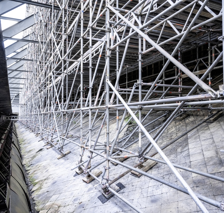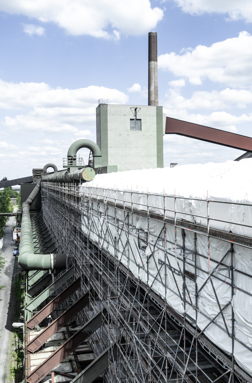 Inside the quenching hall, three birdcage scaffolding elements – each 8,000 m3 in size and completely wrapped in foil plastic sheeting in places for dust protection – were erected one behind the other, creating safe and readily accessible platforms for carrying out the refurbishing work. Once again, the building had a special challenge in store. A so-called hot alley runs at an elevated level parallel to the tracks inside the building, on which huge railway wagons used to transport coke from the ovens to the quenching tower. From here, the person in charge of the coking plant could keep a watch on the entire process route with the help of a small rail car. Unfortunately, the structural properties of the underground were unclear, meaning the birdcage scaffolding was not allowed to be supported on the floor but had to be built on the rails with the help of wooden beams.
