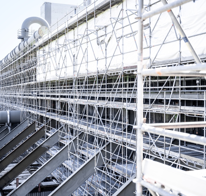On the outside of the quenching hall, the specialists erected 22 m high and 3.53 m wide facade scaffolding totalling an awesome 21,900 m3 over a length of 282 m. The scaffold foundation on the sloping, tiled coke chute was a particular challenge. Additional 0.73 m wide support structures were therefore installed along the entire length to absorb any forces occurring. “We weren’t allowed to drill, we weren’t allowed to put too much stress on the tiles and we were obliged to wedge the entire scaffolding in a very elaborate way inside the building”, Bittner explains. “We laid tubes to the inside in order to dissipate the tensile forces in these areas and absorb them on the interior walls.” Layher Allround Scaffolding offers a wide range of solutions for tricky tasks such as this, even in the standard range, and literally enables ‘more possibilities’.